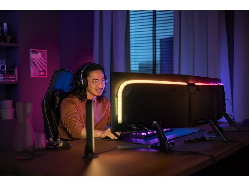 Hue Play gradient series er laget for å gi hjemmeunderholdningen noe helt nytt - en unik opplevelse med synkronisert farget belysning som gir en helt ny dimensjon til favorittunderholdningen din – uansett om det er TV, film, musikk eller spill. Når du parer Play gradient PC lightstrip med den gratis Hue Sync desktop app, får du reaktive lyseffekter som blinker, fader inn og ut og skifter farger i perfekt synkronisering med det som skjer på skjermen. Dette skaper en utrolig surroundbelysning i seg selv, men man kan også kombinere dette med andre Hue lys som viser farge og forvandle hele spillrommet til et kampområde. Denne PC lightstrip er spesialdesignet til 3-skjermsetup for skjermer på 24”- 27” og festes direkte på baksiden av skjermen med den medfølgende monteringsklipsen. Den passer også for enkeltskjemssetup på skjermer i størrelsen 24”- 27” eller 32”- 34” Denne pakken har en Hue Bridge inkludert, så du har alt du trenger for å komme i gang.