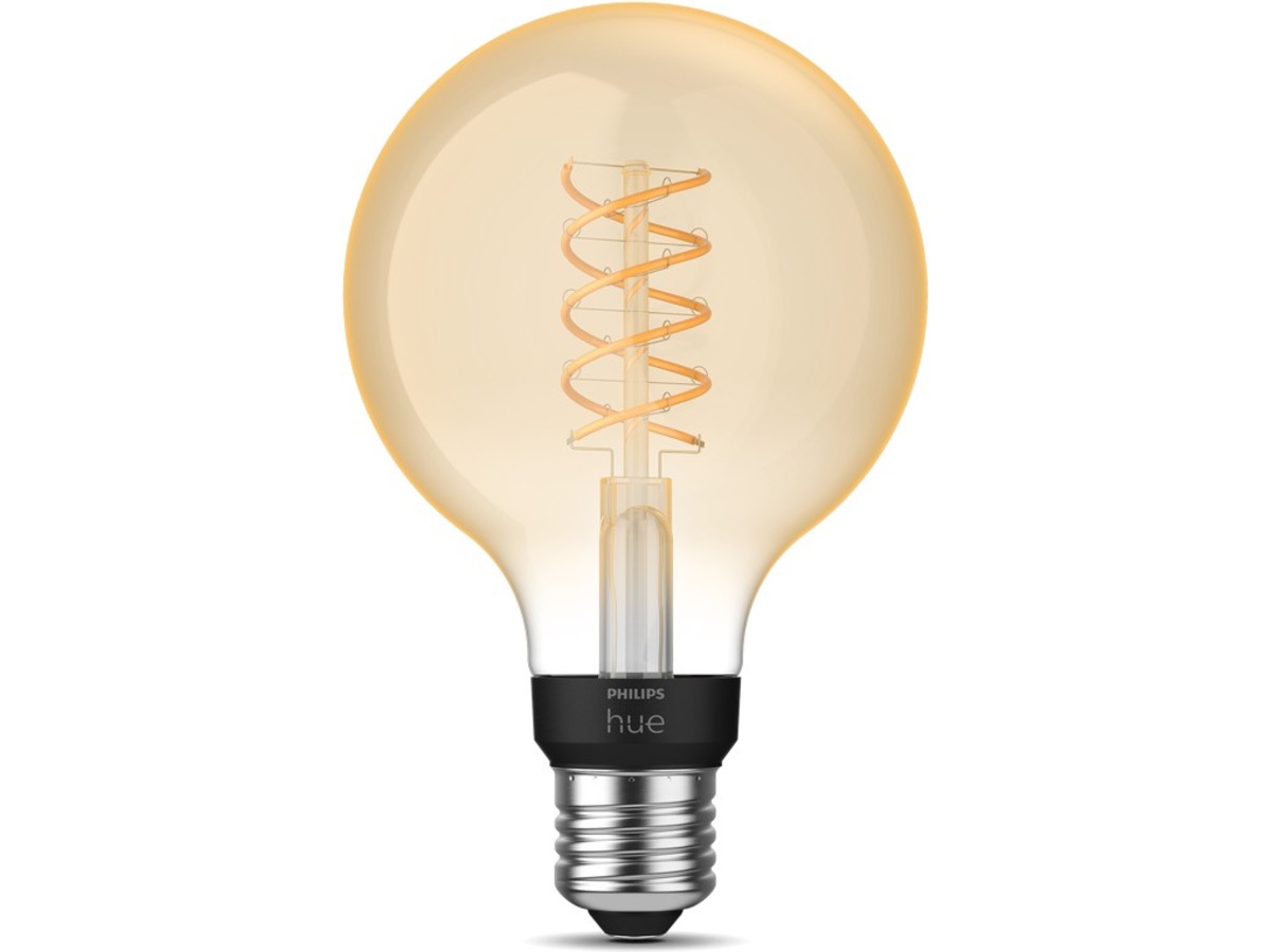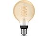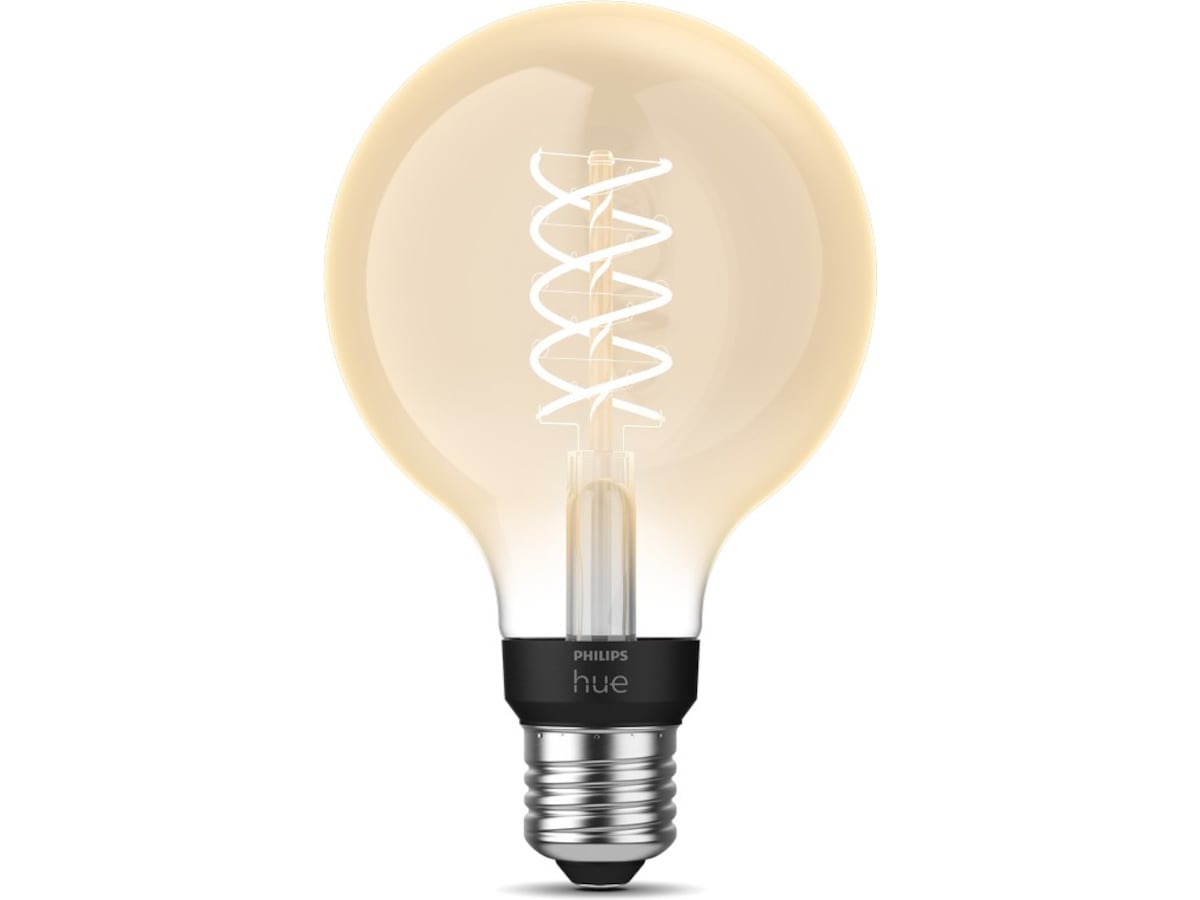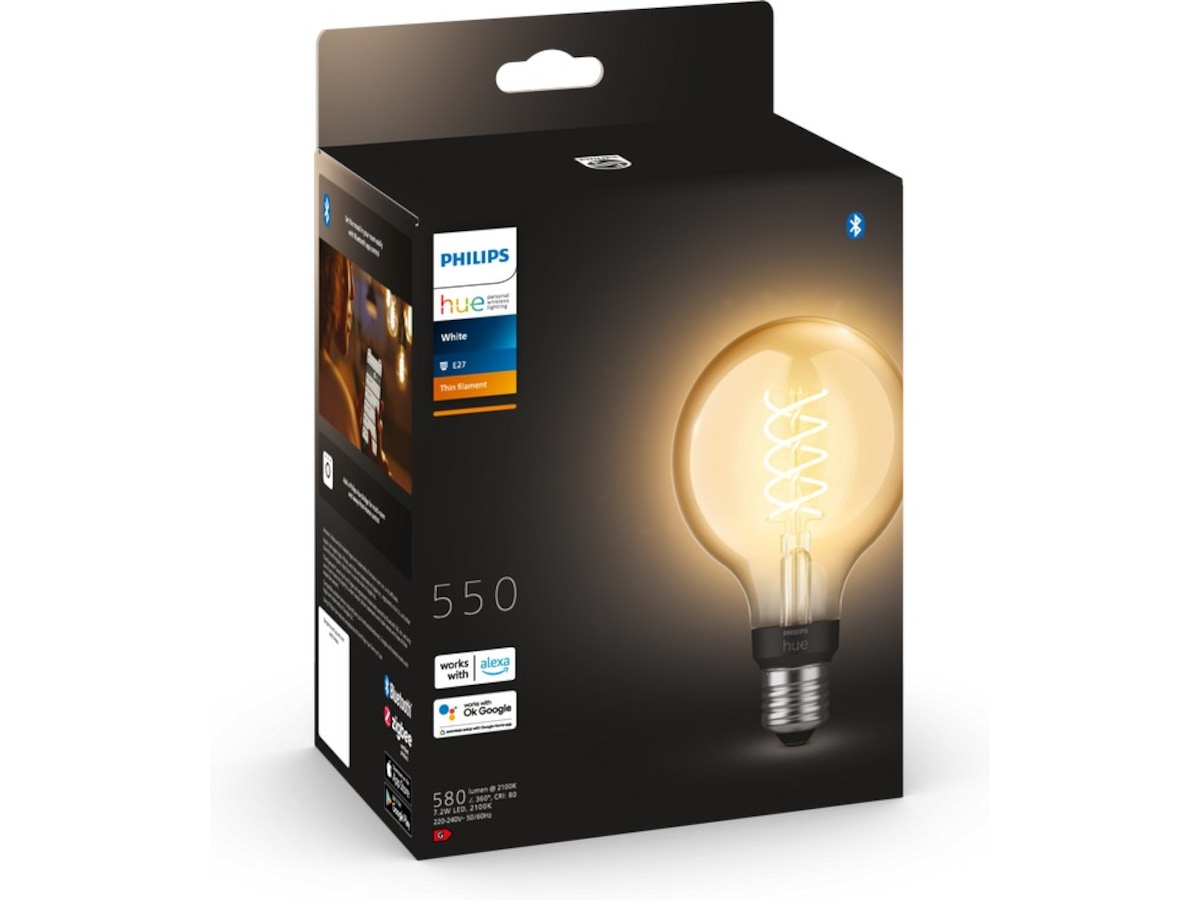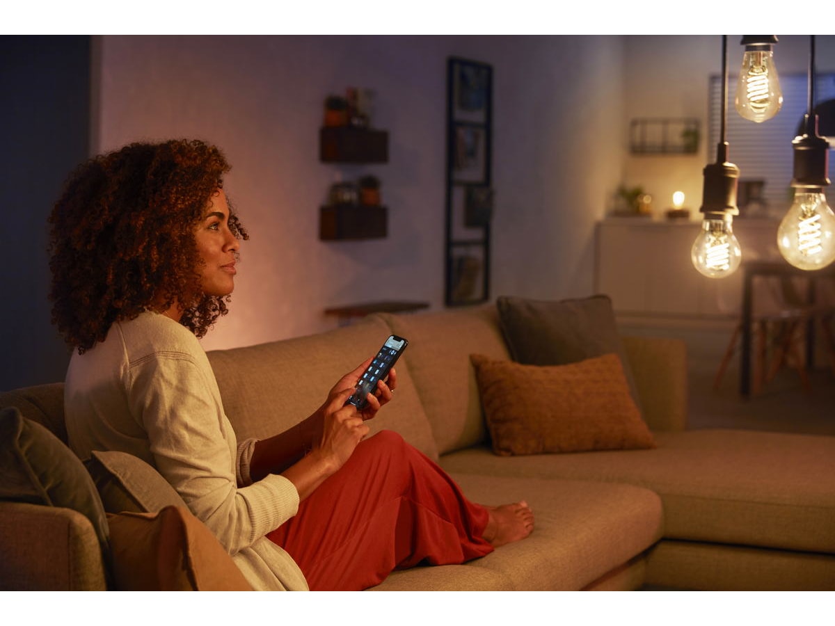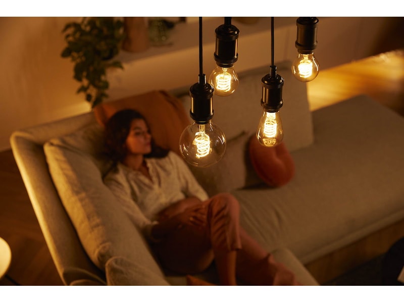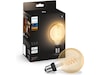 Philips Hue White glødelyskilde har gjennomsiktig glass med synlig filament-LED som skaper en koselig atmosfære rundt lyskilden.