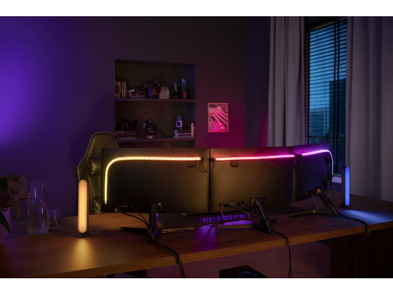 Hue Play gradient series er laget for å gi hjemmeunderholdningen noe helt nytt - en unik opplevelse med synkronisert farget belysning som gir en helt ny dimensjon til favorittunderholdningen din – uansett om det er TV, film, musikk eller spill. Når du parer Play gradient PC lightstrip med den gratis Hue Sync desktop app, får du reaktive lyseffekter som blinker, fader inn og ut og skifter farger i perfekt synkronisering med det som skjer på skjermen. Dette skaper en utrolig surroundbelysning i seg selv, men man kan også kombinere dette med andre Hue lys som viser farge og forvandle hele spillrommet til et kampområde. Denne PC lightstrip er spesialdesignet til 3-skjermsetup for skjermer på 24”- 27” og festes direkte på baksiden av skjermen med den medfølgende monteringsklipsen. Den passer også for enkeltskjemssetup på skjermer i størrelsen 24”- 27” eller 32”- 34” Dette produktet krever en Hue Bridge (ikke inkludert).