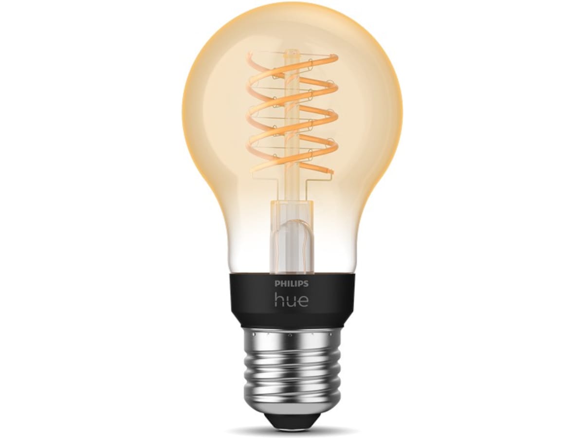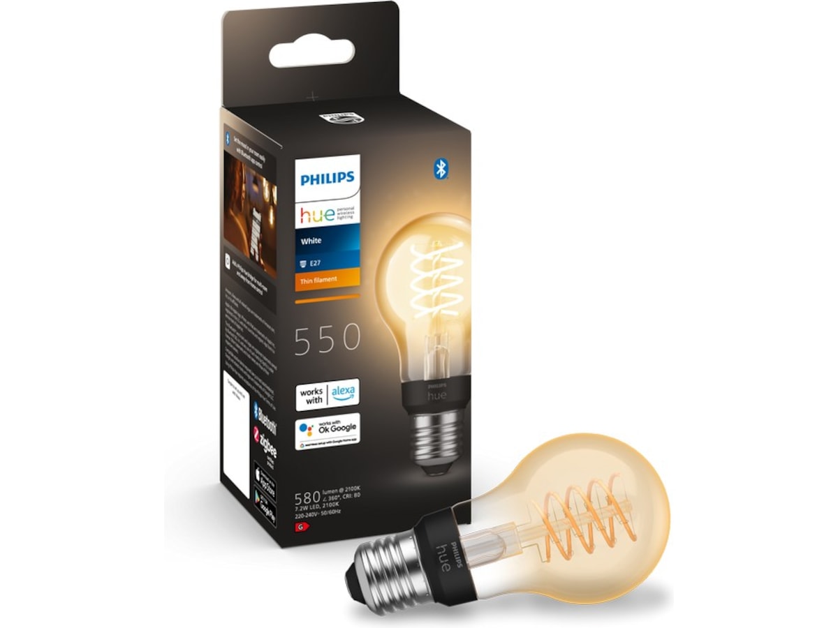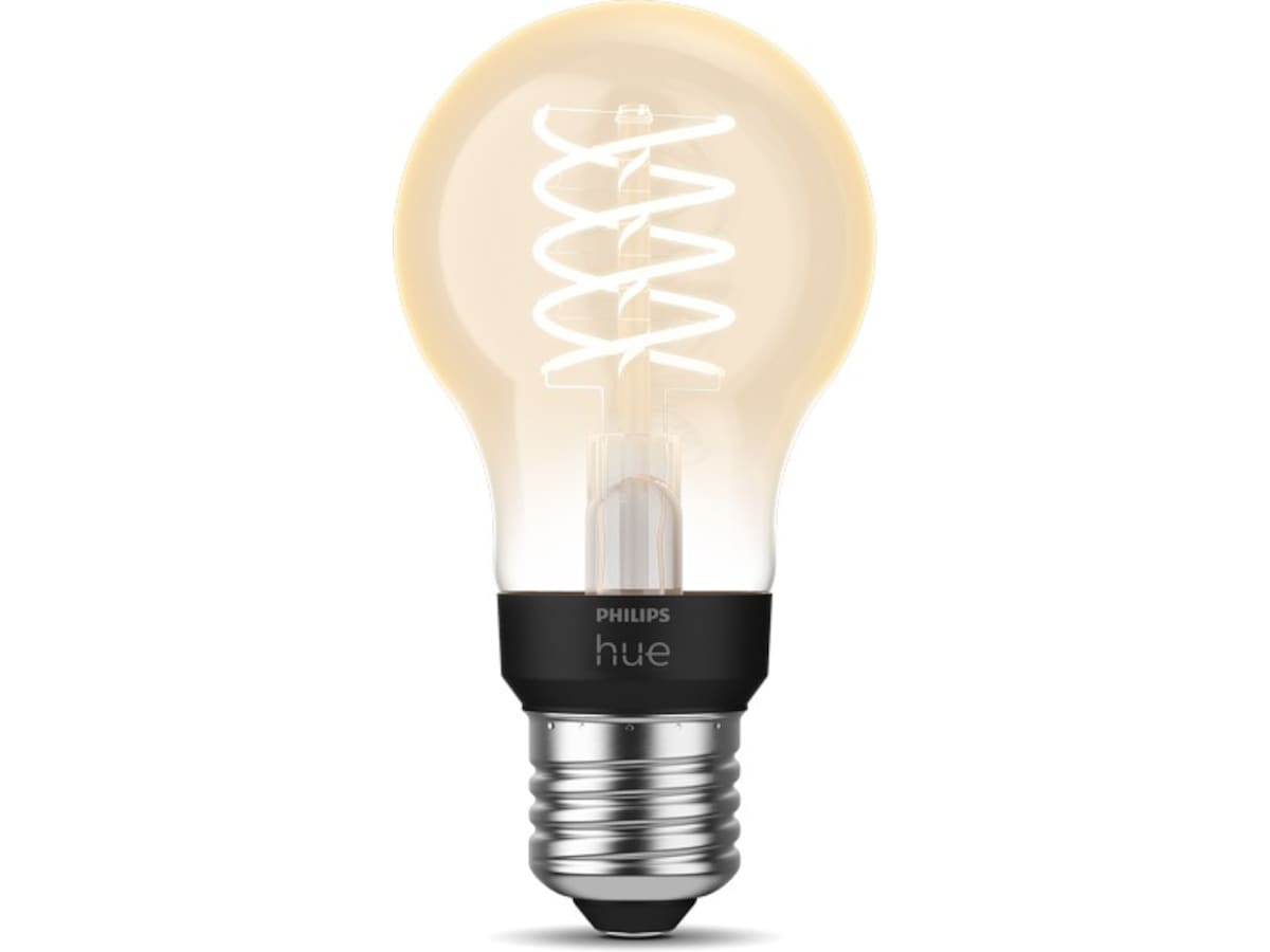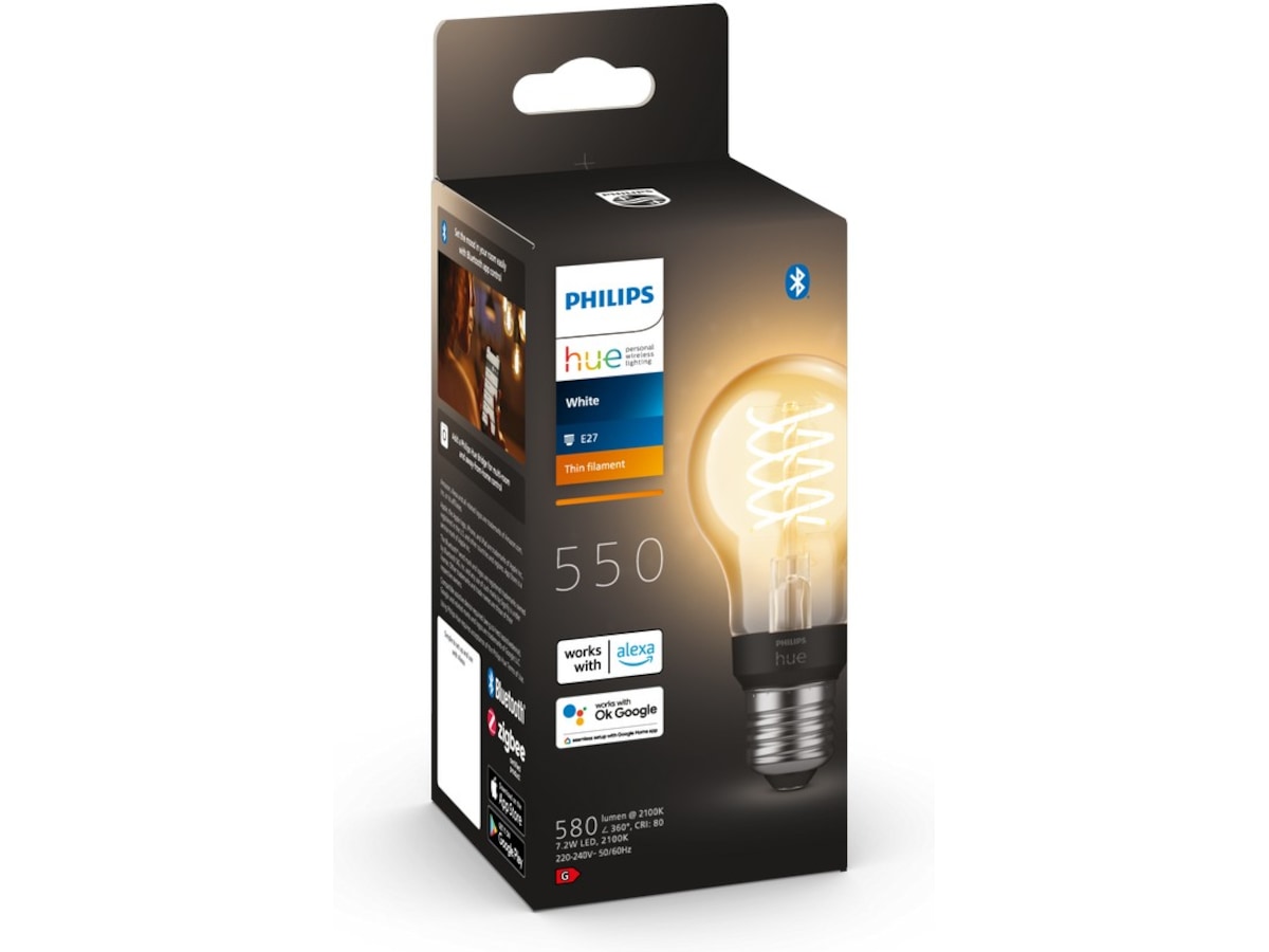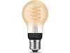 Philips Hue White glødelyskilde har gjennomsiktig glass med synlig filament-LED som skaper en koselig atmosfære rundt lyskilden.