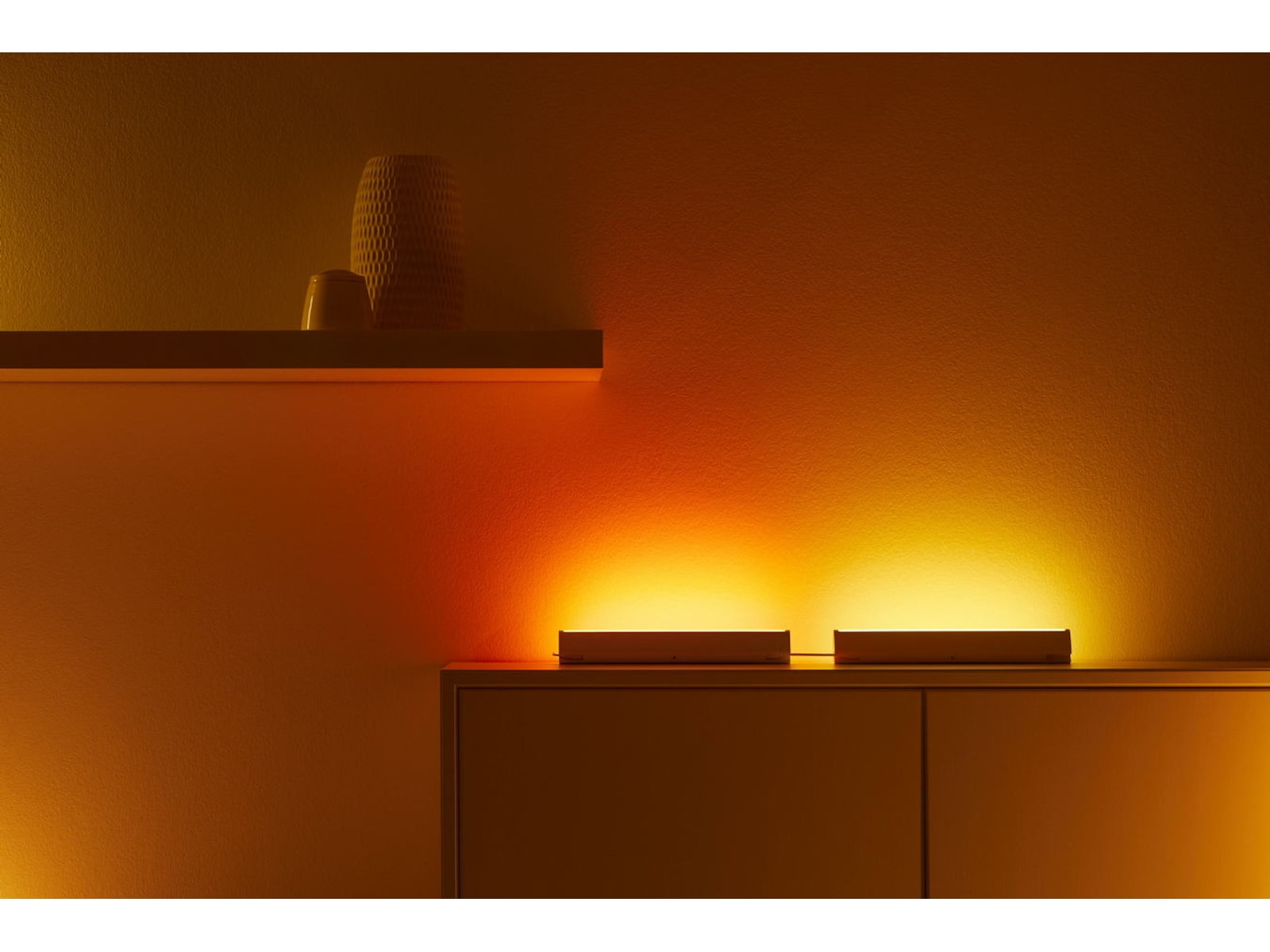Denne 2-pakningen inneholder to sammenkoblede lyslister som kan plasseres fleksibelt i hjørner, langs hyller eller hvor som helst med en avstand på opptil 150 cm. Ved å vippe én eller begge lyslistene til siden er det enkelt å justere lysvinkelen. De slanke lyslistene lyser opp alle slags rom med massevis av fargerikt lys, og de får lett plass i et lite rom. Du har ubegrensede muligheter for å skape den perfekte stemningen og stilen ved hjelp av belysningen, siden hver av lyslistene kan stilles inn til 16 millioner farger eller en hvilken som helst nyanse av varmt til kjølig hvitt lys.