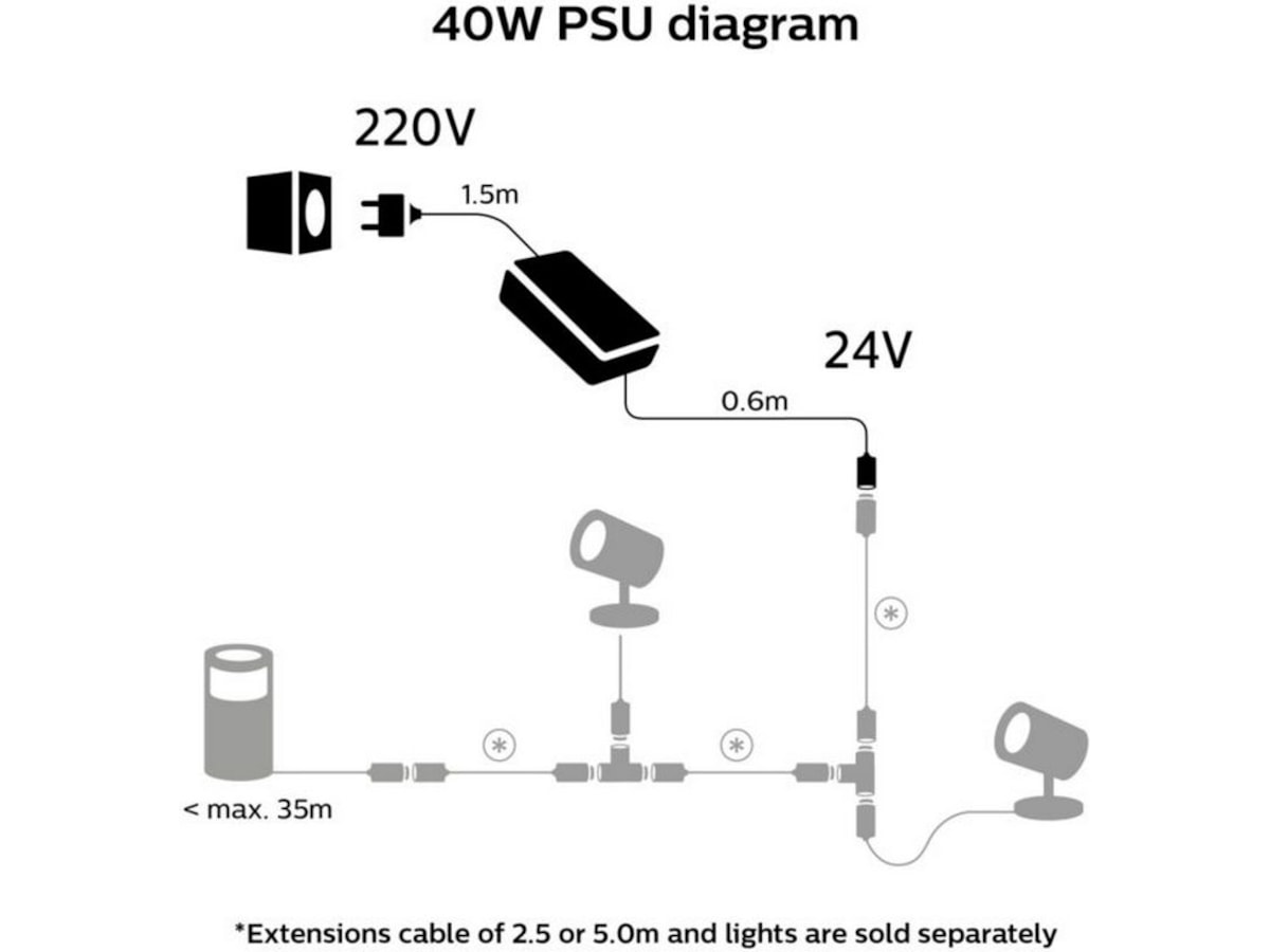 Med 40 W kan du koble til fem lavspenningsarmaturer som Hue Lily og Hue Calla.