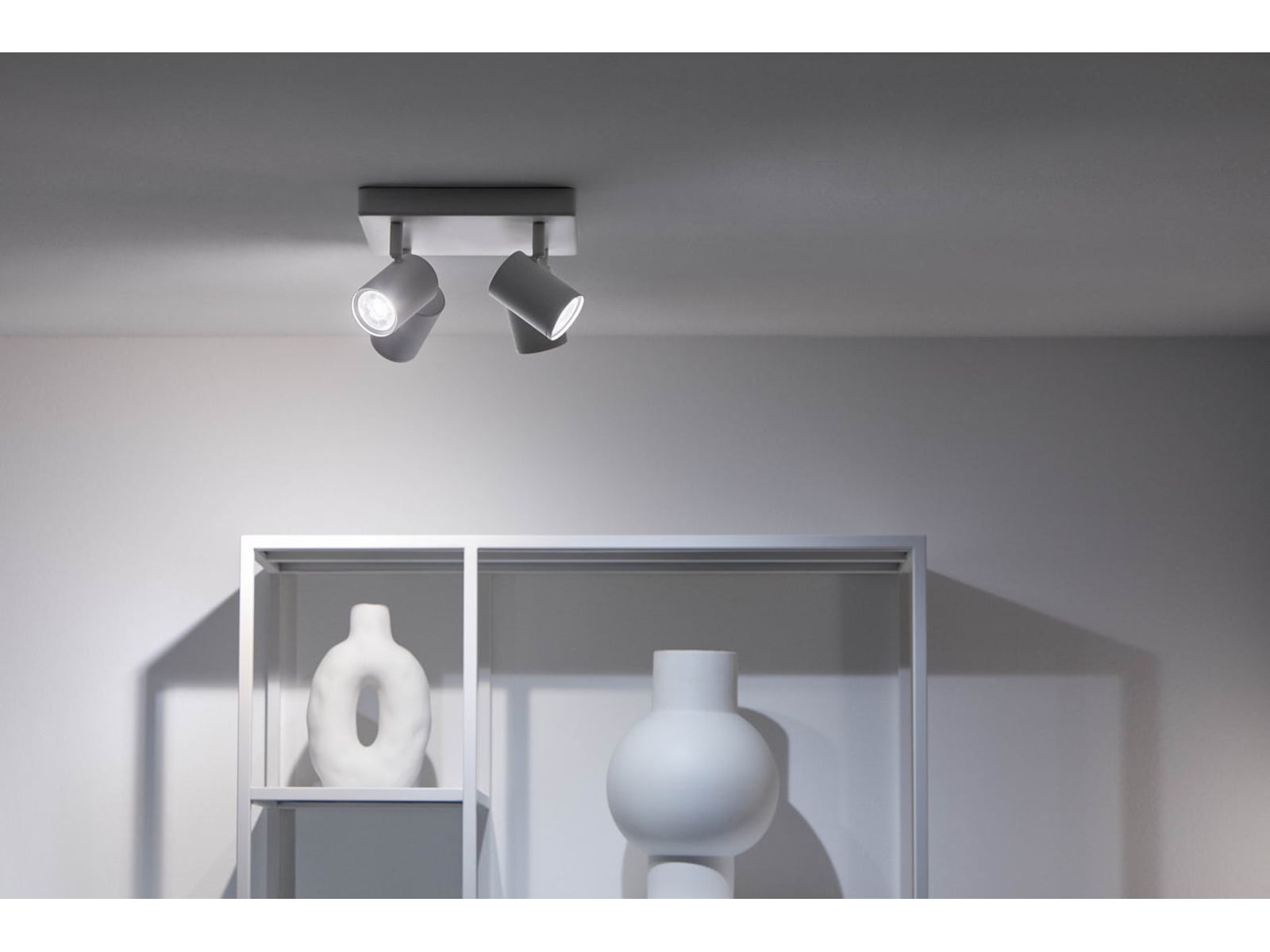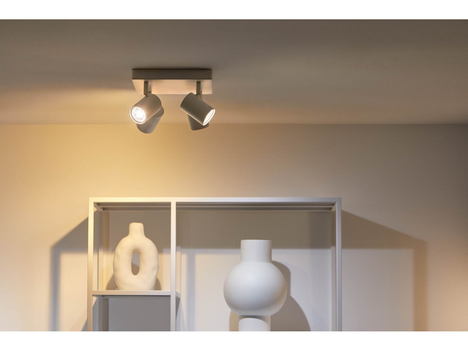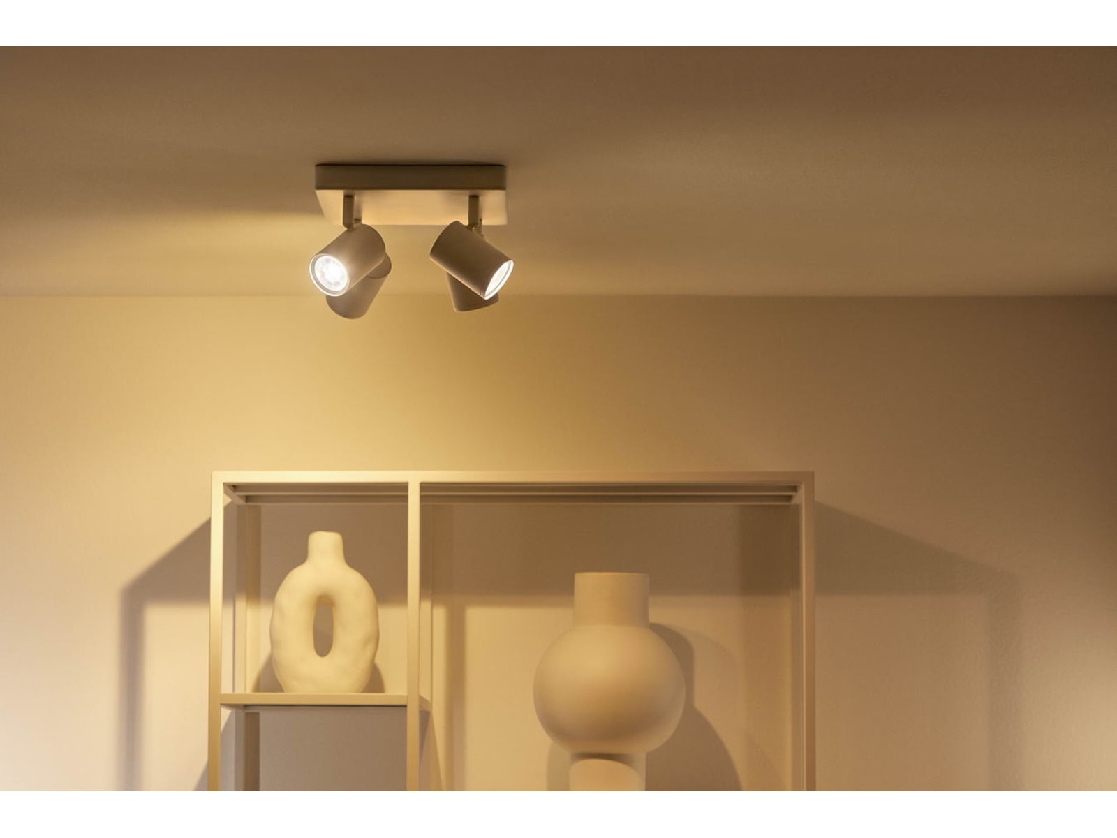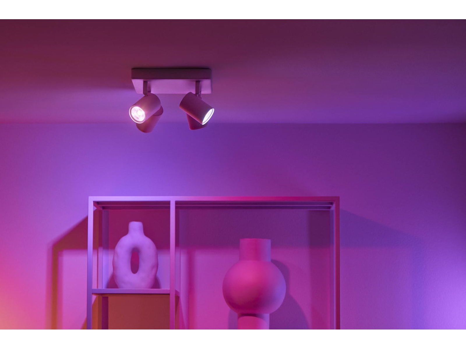 Denne moderne lampen i hvitt har tre justerbare hoder gir lys til hjemmet ditt og setter fokus på dine favorittområder, kunstverk og verdigjenstander. Både deg og hjemmet ditt kommer til å elske muligheten for å kunne justere lyset til enhver av de 16 millioner fargene og velge den lysstyrke og lystemperatur du måtte ønske. La deg imponere av hvor behagelig og enkelt tilgjengelig dynamiske lysmoduser er og hvor flott det er hvis du bader hjemmet ditt i slående lyseffekter som etterligner havets bølger, en sprakende peis eller som følger dagslysets skiftende lys.