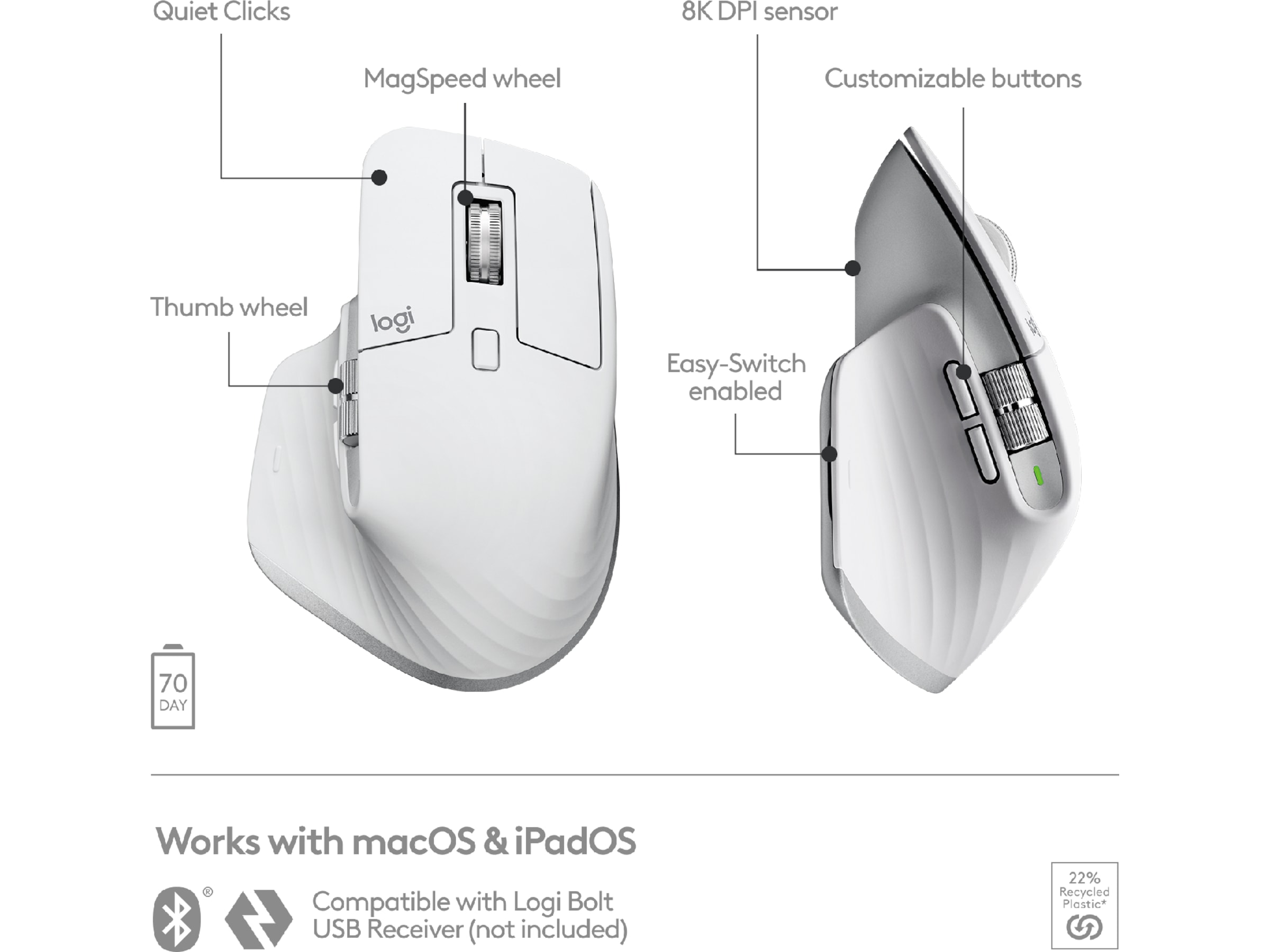 Ladbart batteri, Logitech Flow, Logitech Darkfield Laser Tracking, Tommelhjul, MagSpeed-hjul, Tilpassbar DPI, Quiet Clicks-teknologi, Tommelstøtte, Håndbevegelsesfunksjon