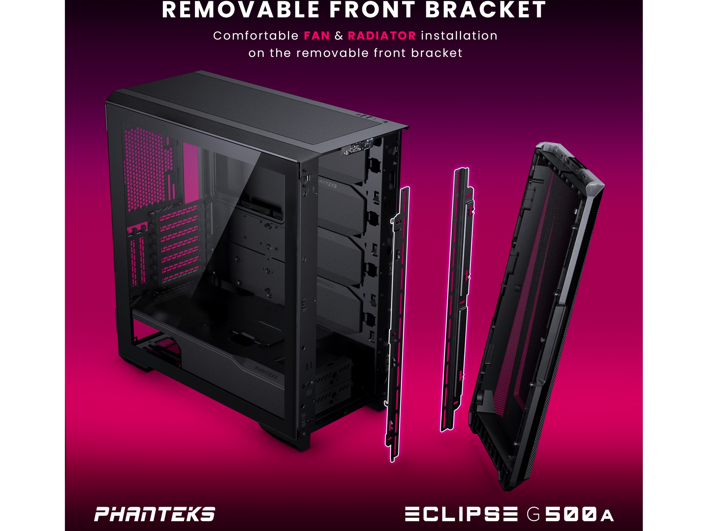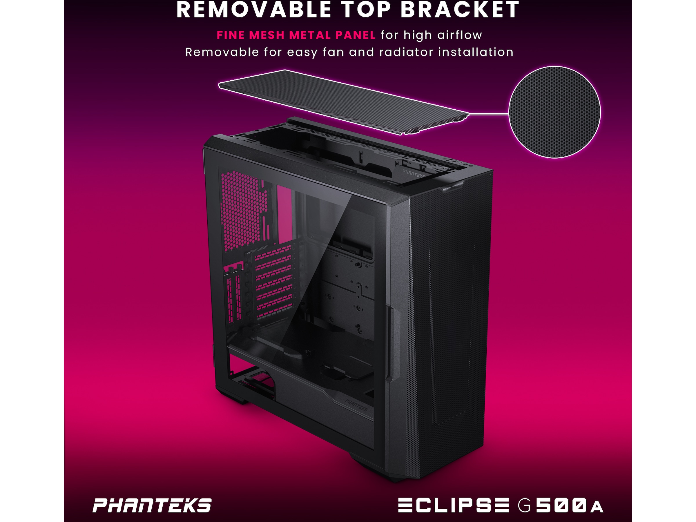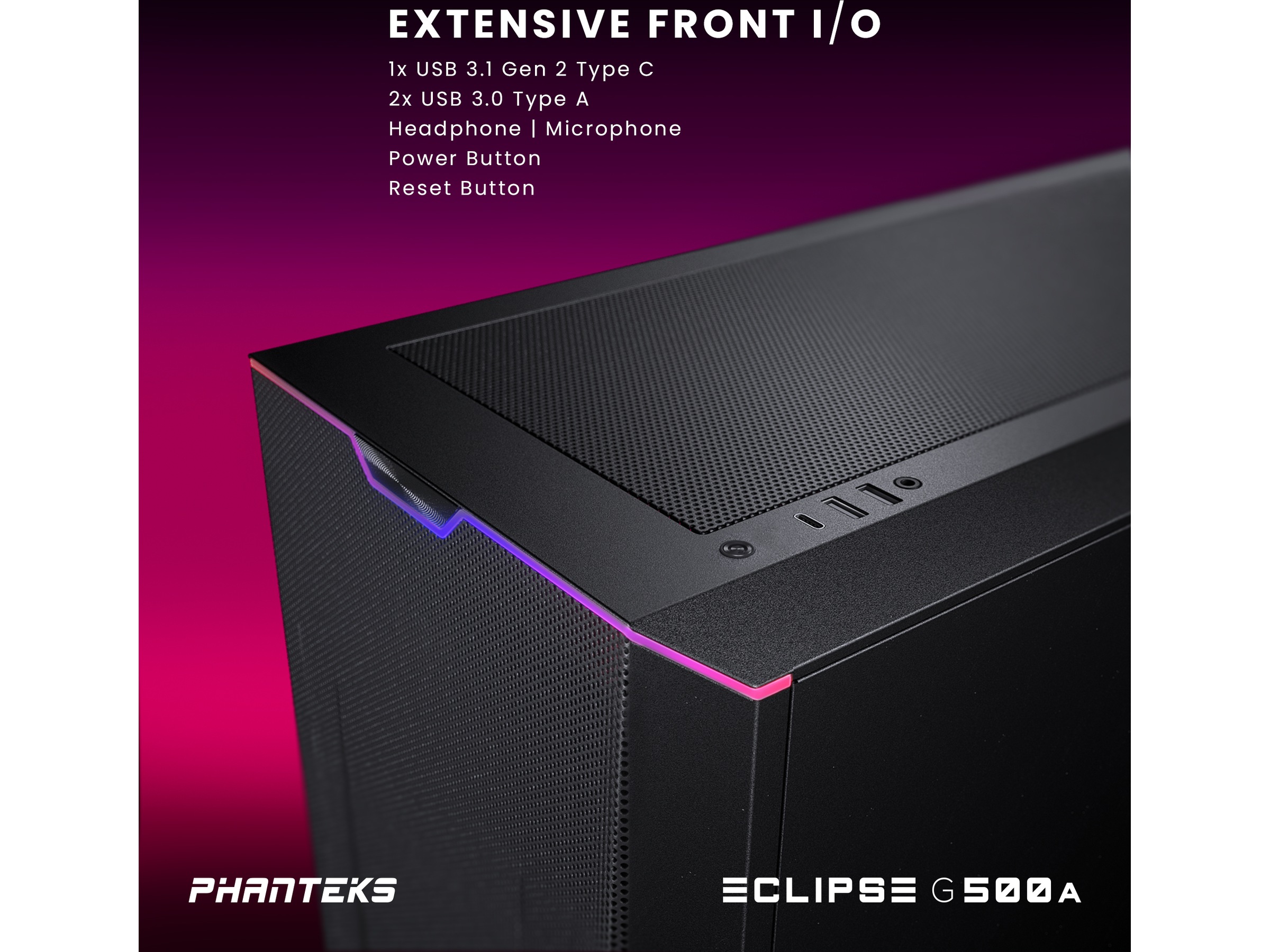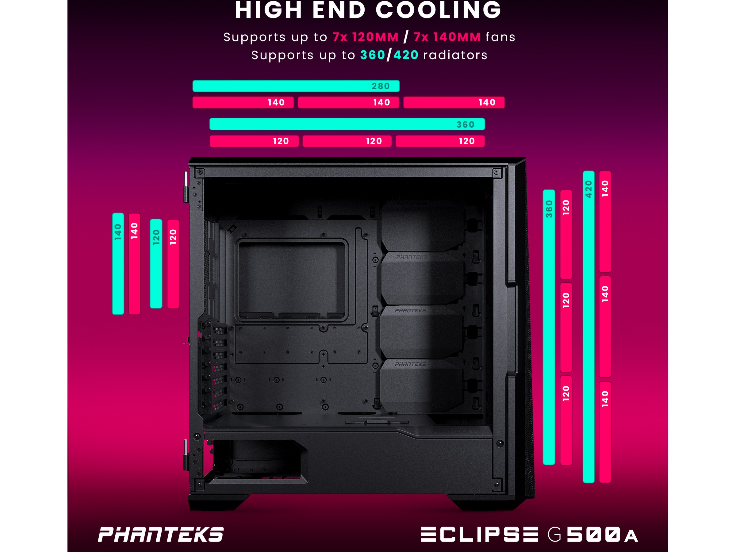 Eclipse G500A presser grensen med sin design med høy luftstrøm for å muliggjøre neste generasjons CPU- og GPU-ytelse. Både front- og toppanelet har Phanteks’ design med ekstra fin netting som kombinerer høy luftstrøm med utmerket støvfiltrering, alt i ett. Med sin romslige innside er G500A klar for kraftige gamingoppsett, og har 420 mm-radiatorer foran og 360 mm radiatorer i toppen, samtidig som den har god plass for GPU-er i full lengde, flere HDD- og SSD-plasseringer, og mulighet for montering av vertikal GPU.