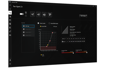 ASUS Fan Xpert 2+-programvaren tilbyr omfattende styring av viftene.Auto-Tuning-modus konfigurerer alle parametere på en intelligent måte med ett enkelt klikk.Det finnes også en ekstremt stillegående modus som senker viftehastighetene under standardens minimum for å holde systemet musestille når du utfører lette oppgaver.Vifter kan også styres via UEFI BIOS.