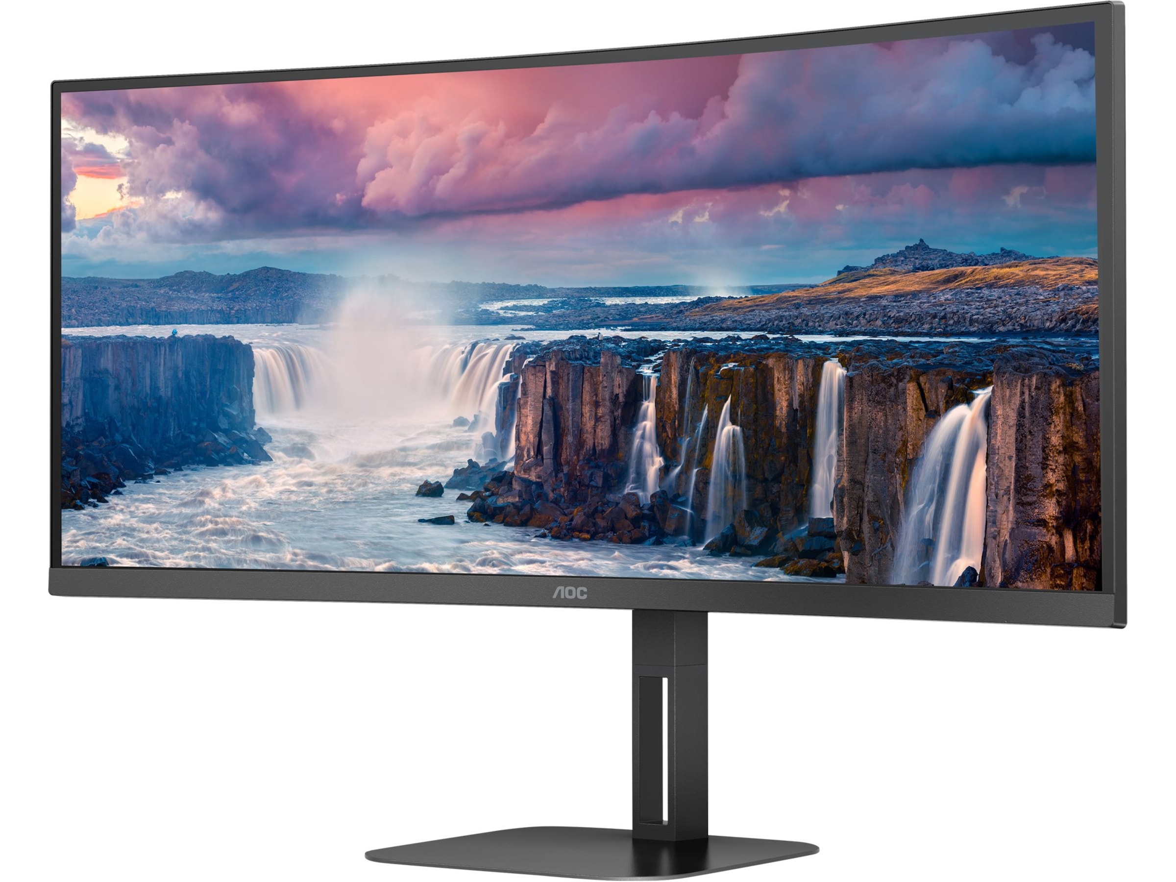 AOC CU34V5C er utstyrt med et kurvet 34” VA-panel med ultravid QHD 21:9-oppløsning for altoppslukende brukeropplevelse i et tresidig rammeløst chassis som du kan tilte og høydejustere etter behov. Klar for å øke produktiviteten din med USB-C med Power Delivery opptil 65W, fire USB-porter og HDMI, tilbyr den også bilde for bilde-MultiView for den mest kompliserte fleroppgavekjøringen.