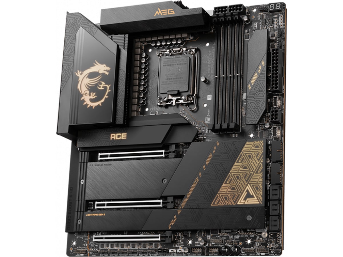 Førsteklasses estetikk med mørk svart overflate og gulldetaljer. MEG Z790 ACE er utviklet for å låse opp det fulle spillpotensialet i den nyeste 13. generasjons Intel® Core-prosessoren ved å kombinere støtte på elitenivå for maskinvaresystem og førsteklasses holdbarhet, og er en enestående E-ATX-plattform for ekstreme innstillinger når det gjelder overklokking av prosessor, minne og skjermkort på høyeste nivå.