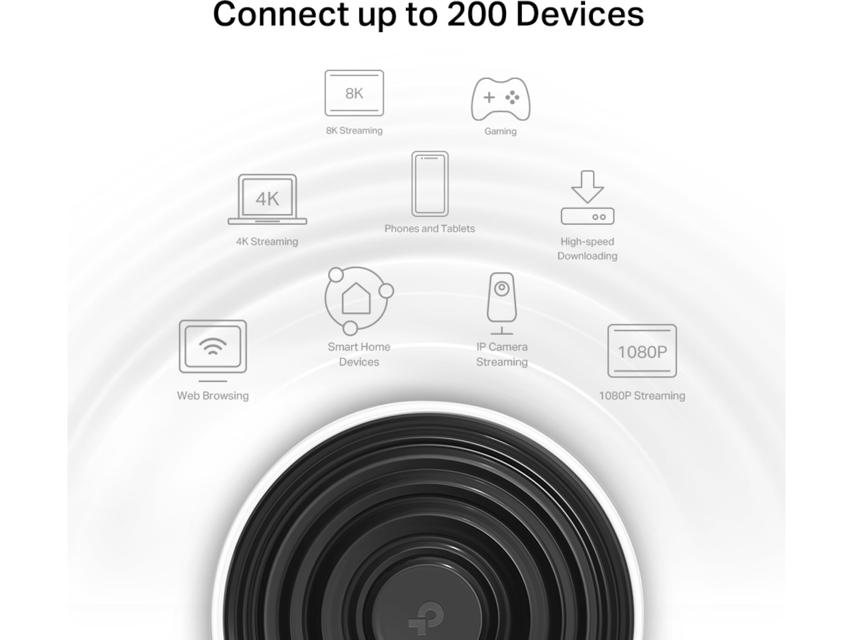 • Ekte tri-band-hastighet - Alle tre WiFi-båndene fungerer sammen for å frigjøre nettverkets totale hastigheter på opptil 5400 Mbps for 200 enheter