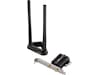 WiFi 6E PCI-E-adapter med 2 eksterne antenner og magnetisert sokkel. Støtter 6 GHz-bånd, 160 MHz, Bluetooth 5.2, WPA3-nettverkssikkerhet, OFDMA og MU-MIMO