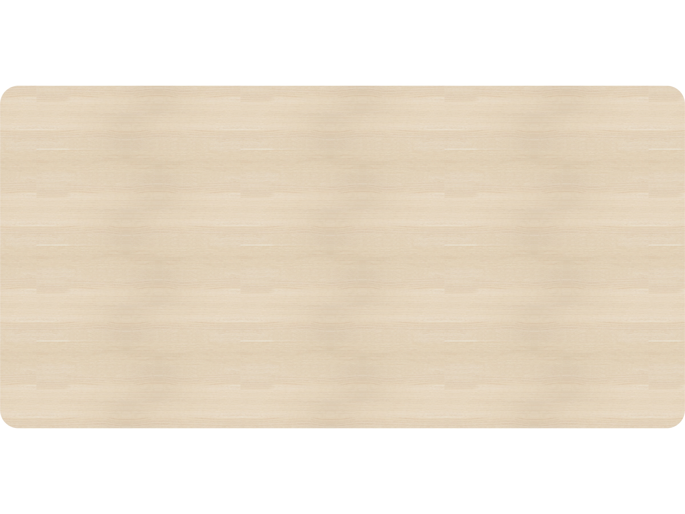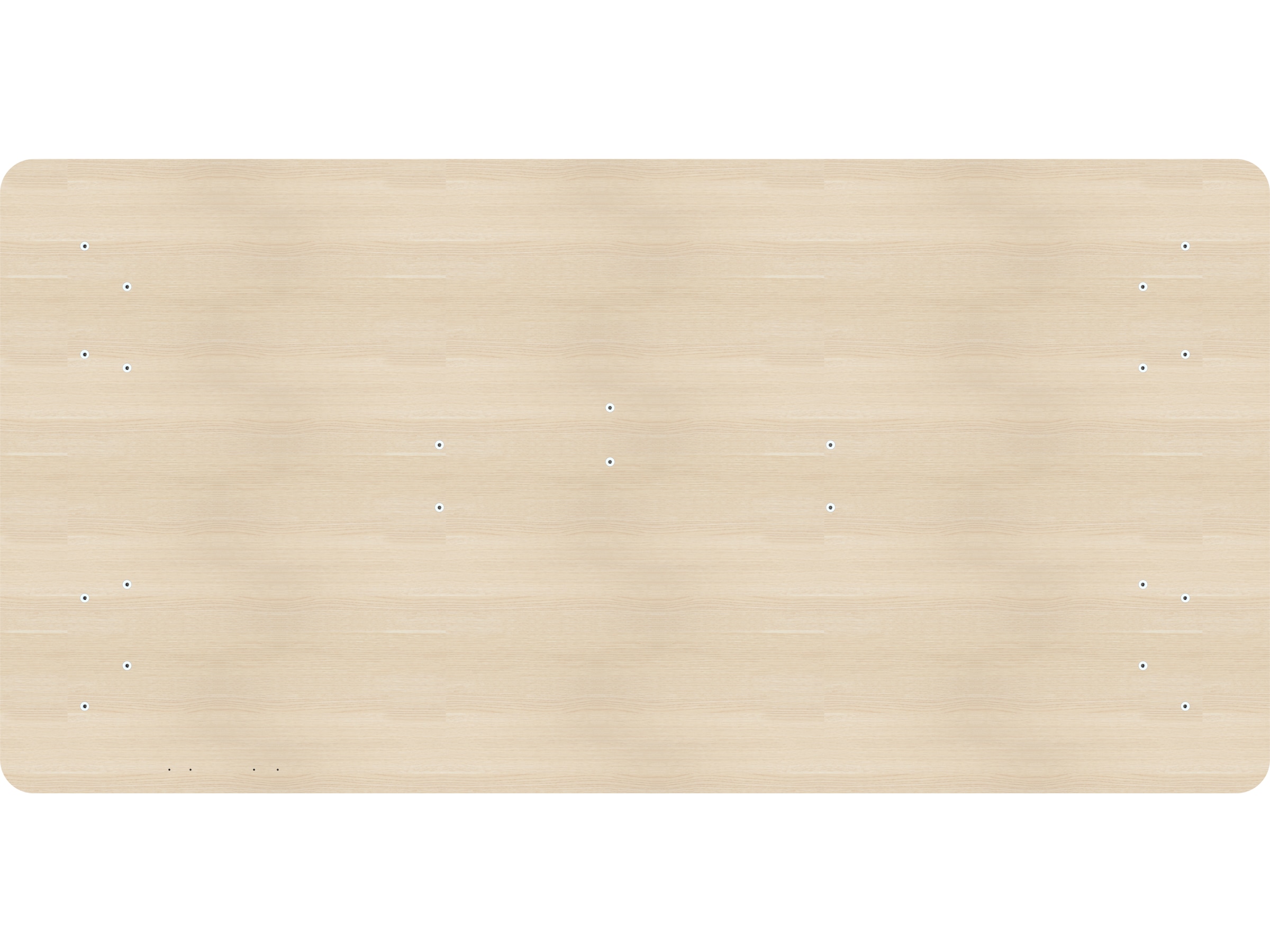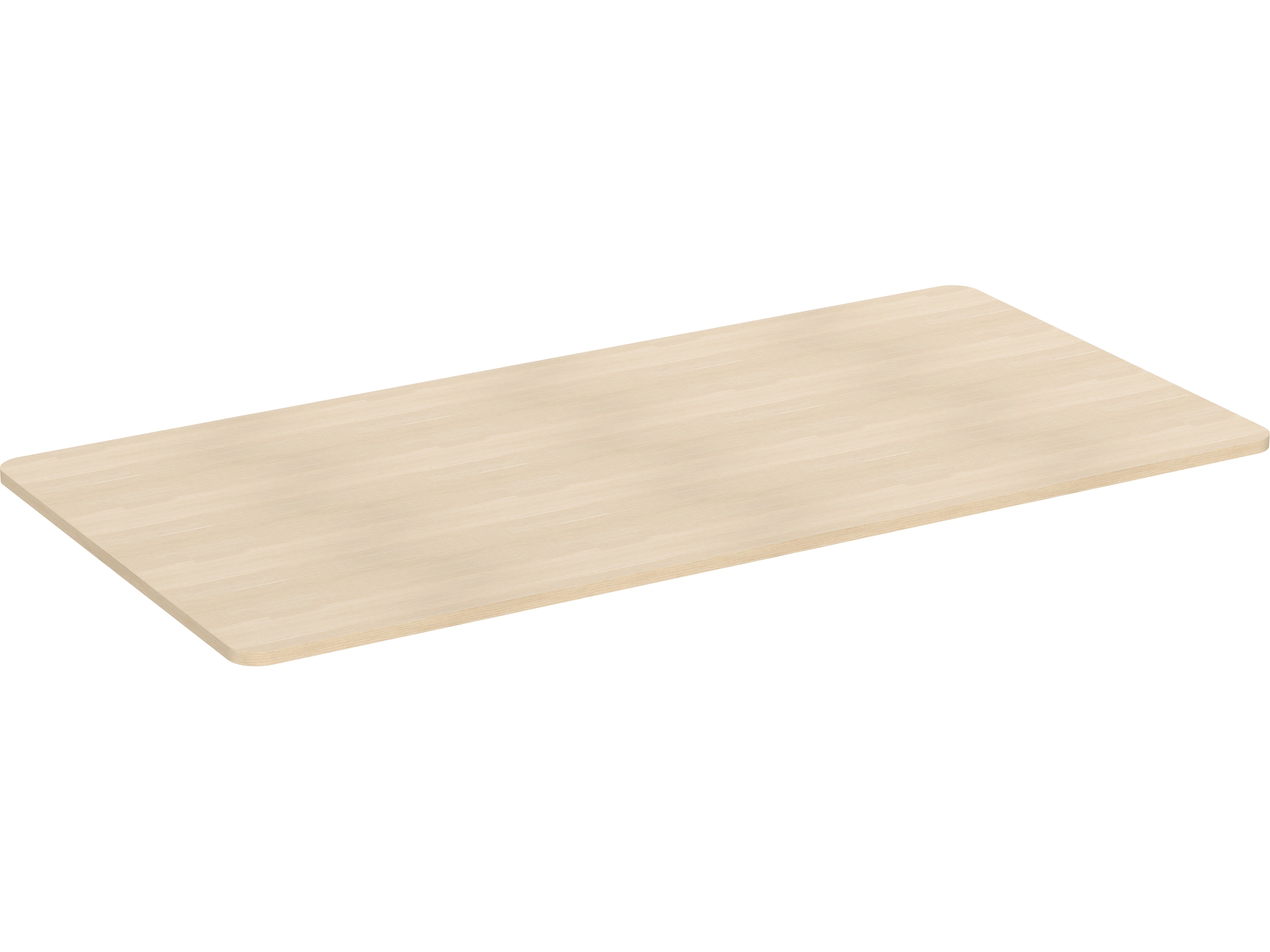 Skrivebordsplate med avrundede kanter og forborede skruehull. Bordplaten er laget av spon og har en laminert overflate som gjør platen slitesterk og legg å holde ren.