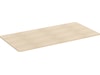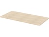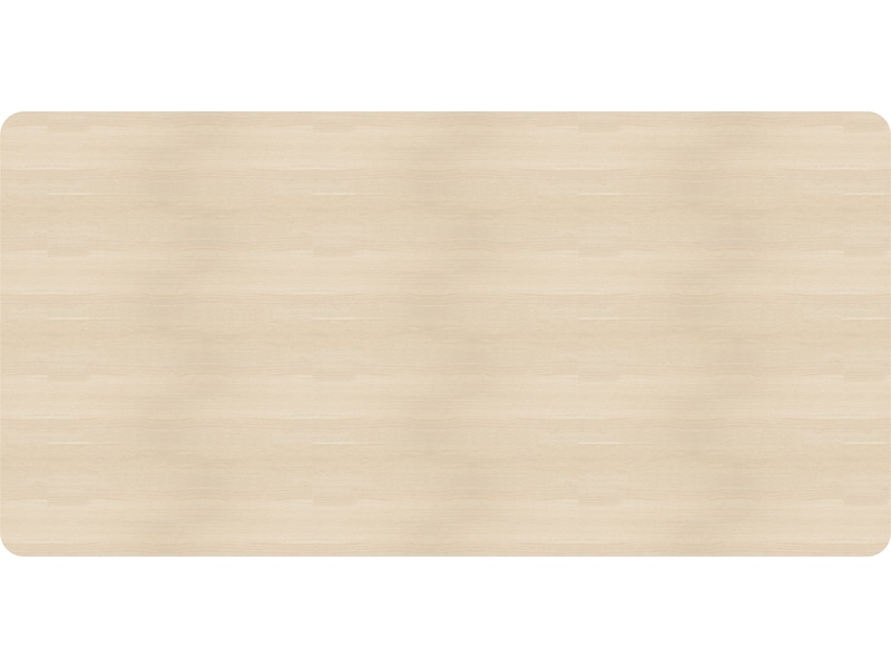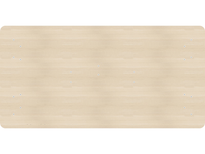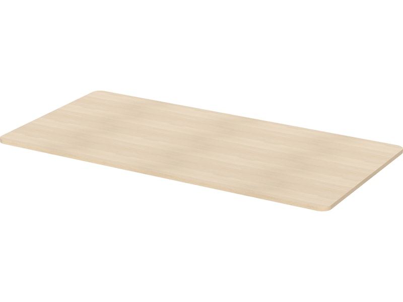 Skrivebordsplate med avrundede kanter og forborede skruehull. Bordplaten er laget av spon og har en laminert overflate som gjør platen slitesterk og legg å holde ren.