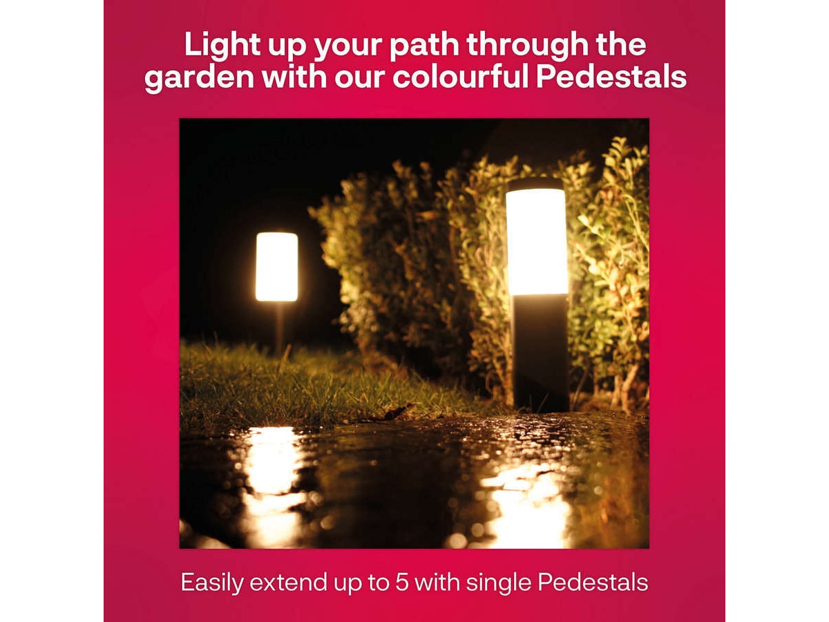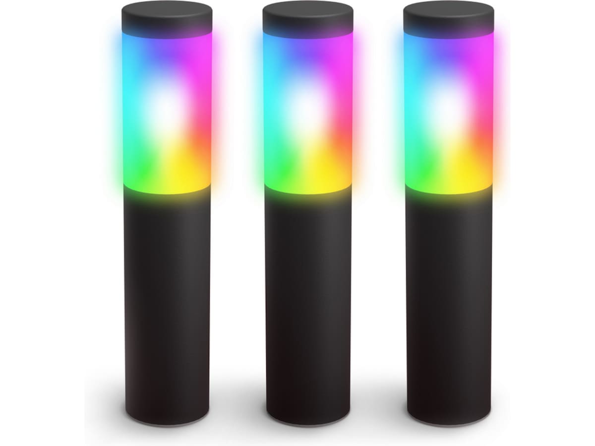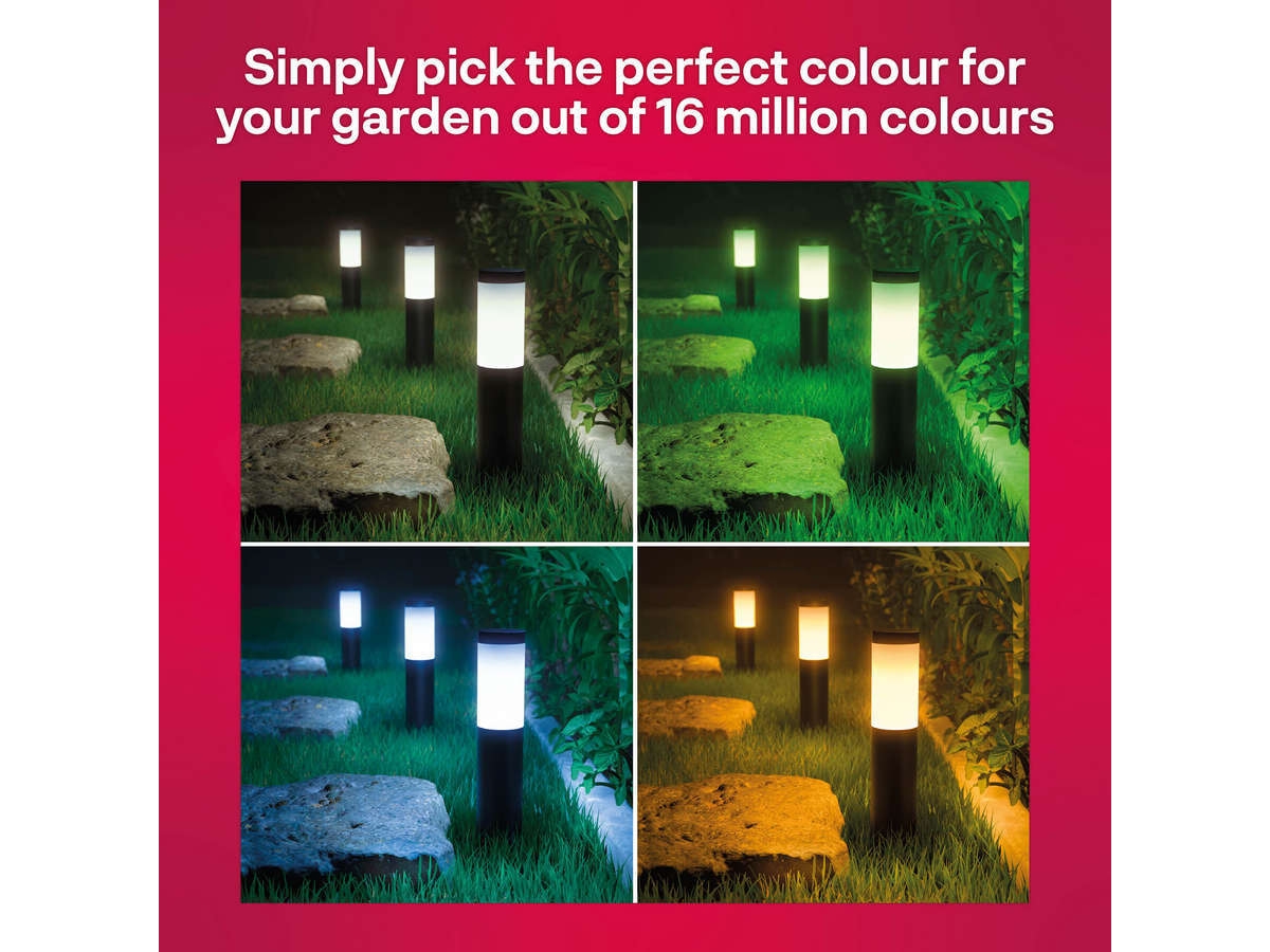 Med dette settet med 3 smarte sokkellys kan du lyse opp hagen eller balkongen på en attraktiv måte og betjene den trådløst, selv når du ikke er hjemme. Sett sokkellysene ned i gresset eller mellom plantene for stemningsskapende, dekorative aksenter. Ved siden av hagestien eller terrassen gir sokkellysene et vakkert og funksjonelt spredt lys. Med denne utendørsbelysningen kan du ved hjelp av appen velge varmhvitt lys for ekstra stemning eller gi ekstra farge til eksteriøret ditt med en av de 16 millioner lysfargene.