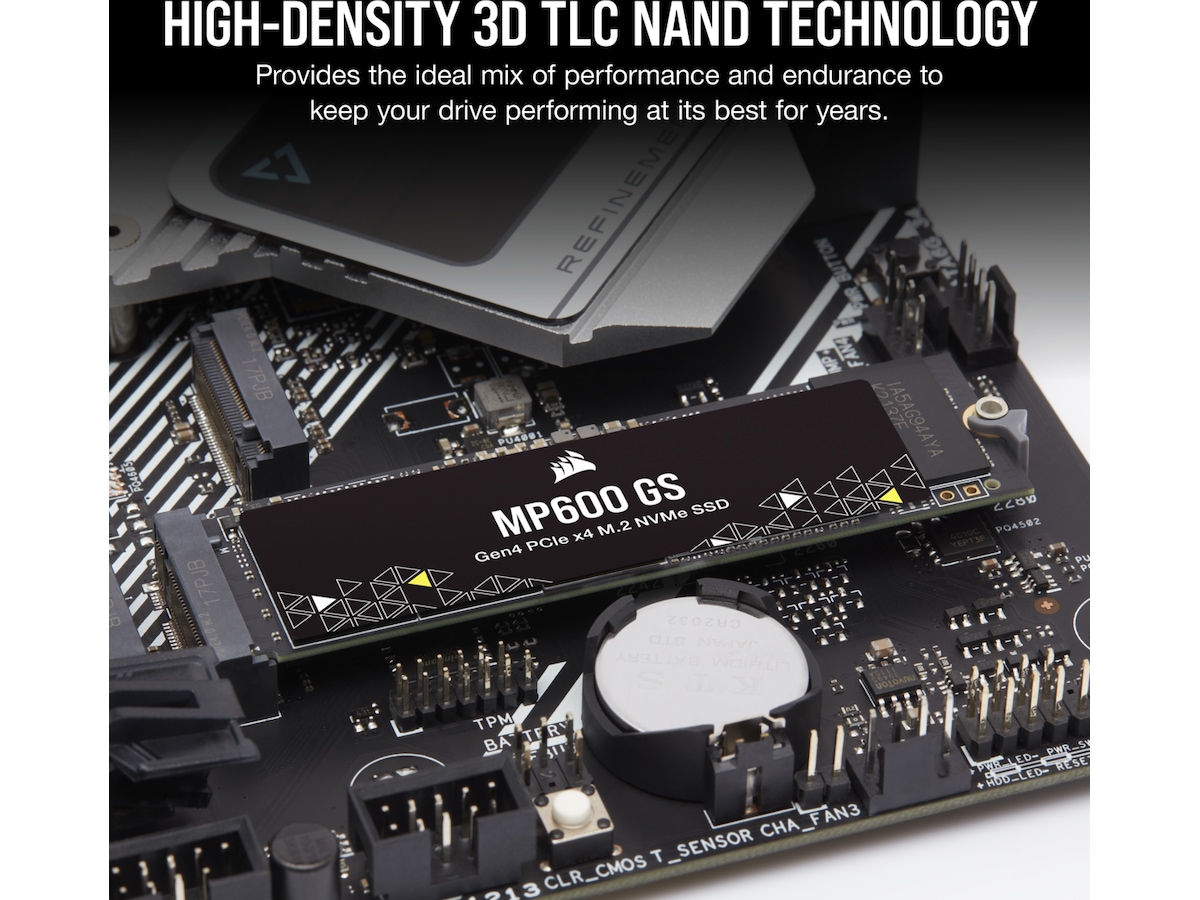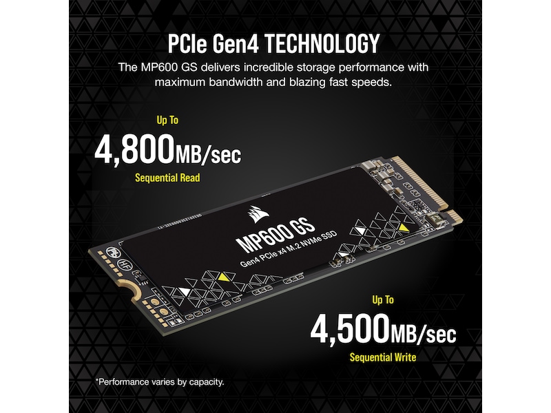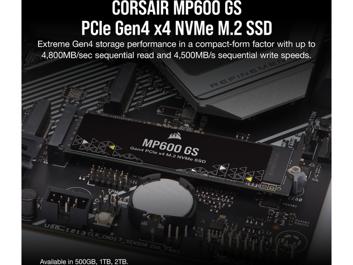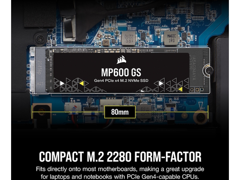 Corsair MP600 GS NVMe M.2 SSD EKSTREM GEN4-LAGRINGSYTELSE En PCIe Gen4 x4-kontroller leverer fenomenal lese-, skrive- og responstider som langt overgår standard M.2 SSD-er.