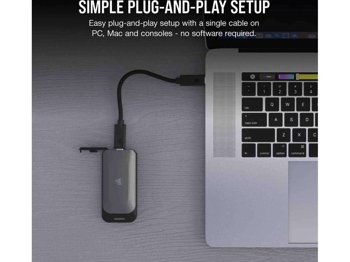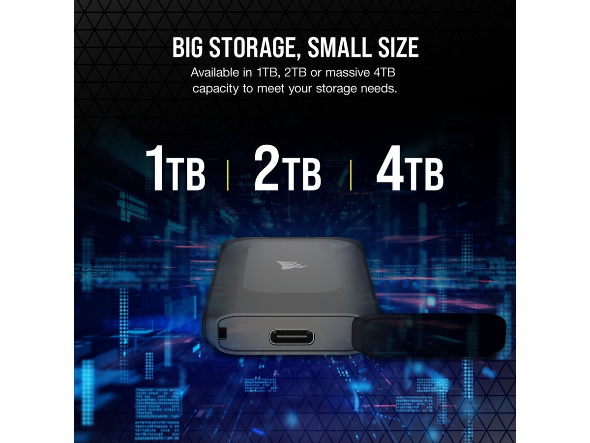 Enten du har utrolig store filer eller mange digitale spill, kommer CORSAIR EX100U i kapasitetsstørrelser på 1 TB, 2 TB eller 4 TB, for rikelig med lagringsplass for dine behov.