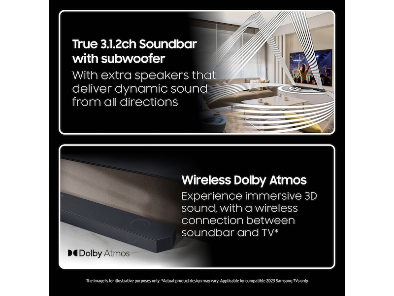 Samsung HW-S811B/XE Lydplanke Dynamisk lyd med oppover vendte høyttalere for en naturtro surround-opplevelse. Stilren Soundbar med imponerende design som ikke stikker seg mer ut enn TV-en. Opplev omsluttende tredimensjonal lyd, nå med trådløs forbindelse mellom TV og Soundbar. TV-høyttalerne samarbeider med Soundbaren for å gjøre lydopplevelsen større.