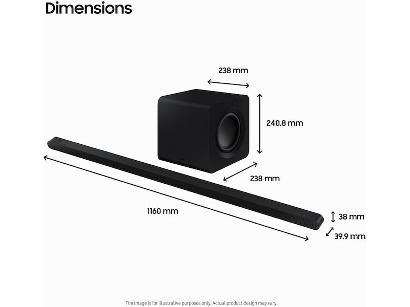 Lydbjelke: 116 cm x 3.99 cm x 3.8 cm / 1.4 kg, Subwoofer: 23.8 cm x 23.8 cm x 24.08 cm / 6.4 kg