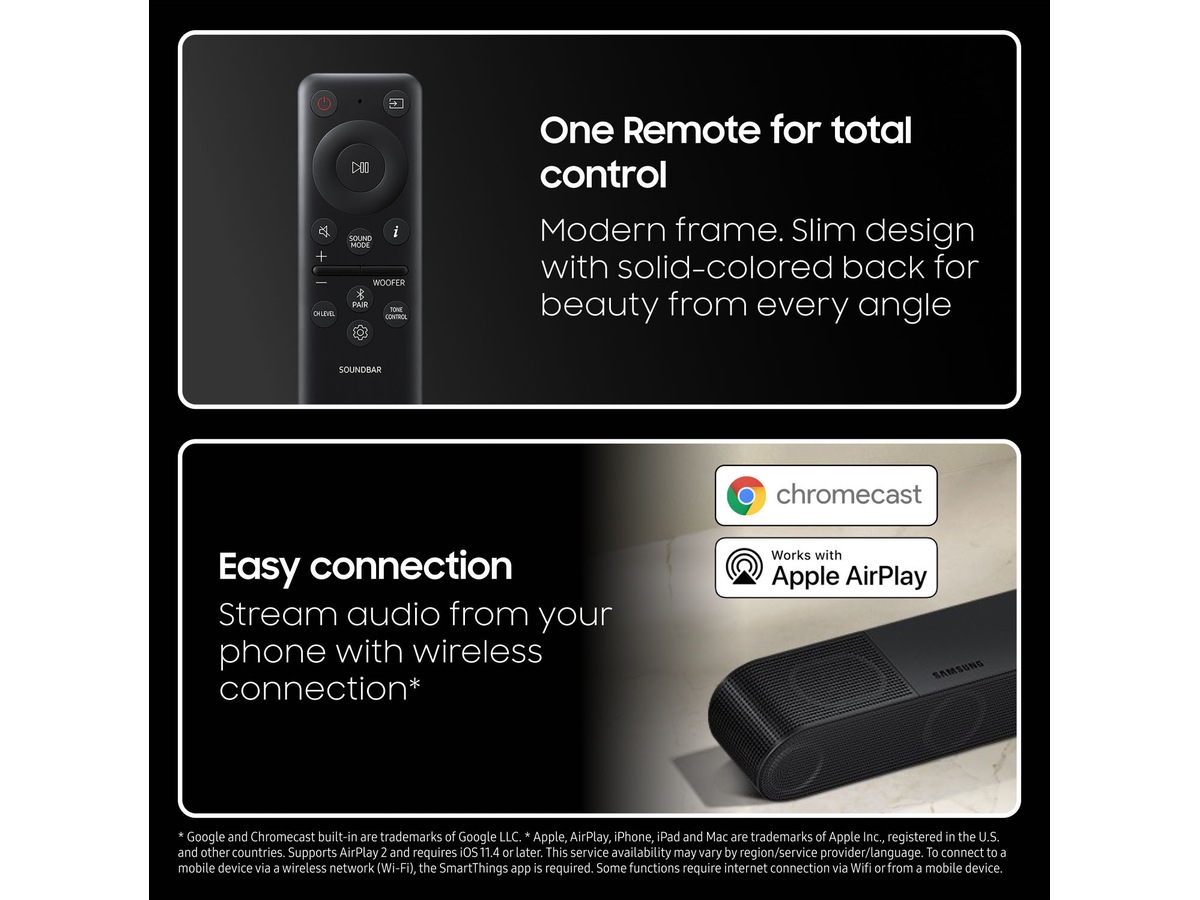 Samsung HW-S811B/XE Lydplanke Dynamisk lyd med oppover vendte høyttalere for en naturtro surround-opplevelse. Stilren Soundbar med imponerende design som ikke stikker seg mer ut enn TV-en. Opplev omsluttende tredimensjonal lyd, nå med trådløs forbindelse mellom TV og Soundbar. TV-høyttalerne samarbeider med Soundbaren for å gjøre lydopplevelsen større.