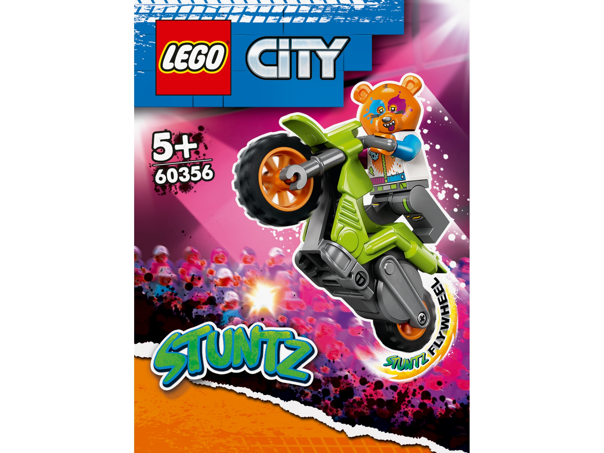 • Hva inneholder esken? En stuntmotorsykkel-leke og en gøyal minifigur av en LEGO® City Stuntz motorsyklist med bjørnehjelm