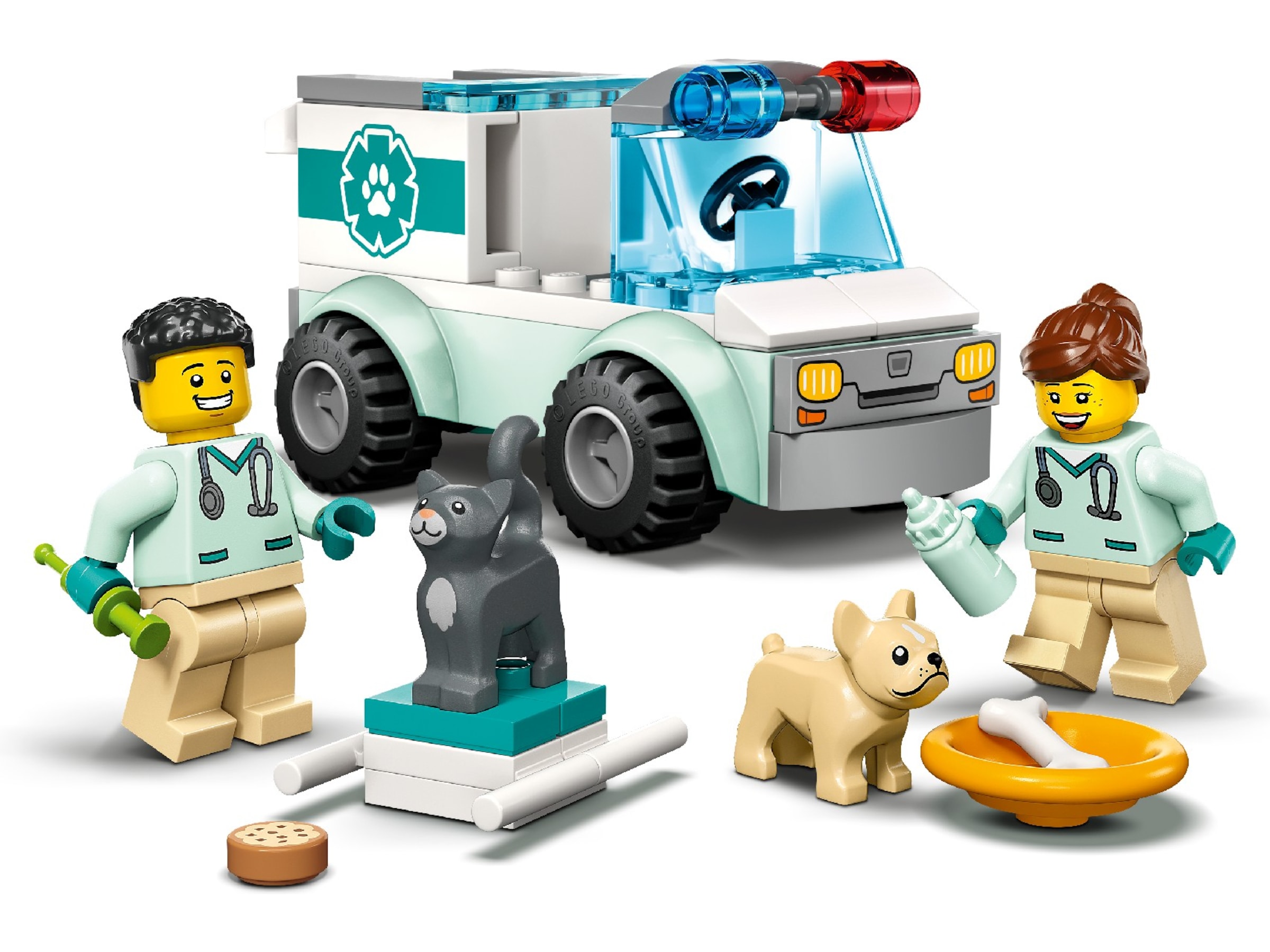 - Hva inneholder esken? Alt barn trenger for å bygge et dyreredningskjøretøy samt to dyrlege-minifigurer, figurer av en hund og en katt samt gøyalt tilbehør