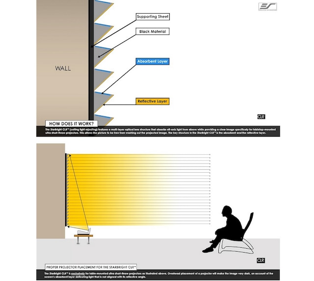 • Materialet i CLR® 3 (Ceiling Light Rejecting) absorberer 90 % av belysningen over lerretet