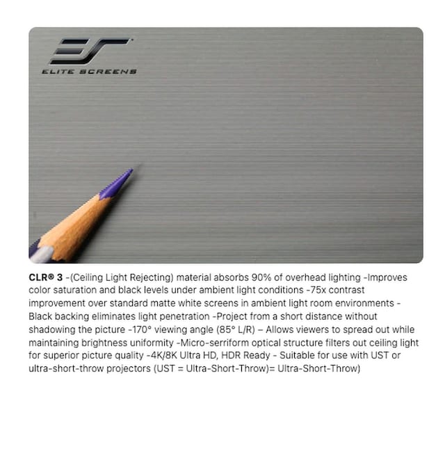 CLR® 3 er spesielt utviklet for projektorer med ekstra kort projeksjonsavstand for å gi en storskjermsytelse i små rom i bolighus og leiligheter eller klasseromsmiljøer. CLR® 3 tilbyr en bred visningsvinkel, nøytral fargetemperatur og forbedret bildekontrast i bilder av kinokvalitet.