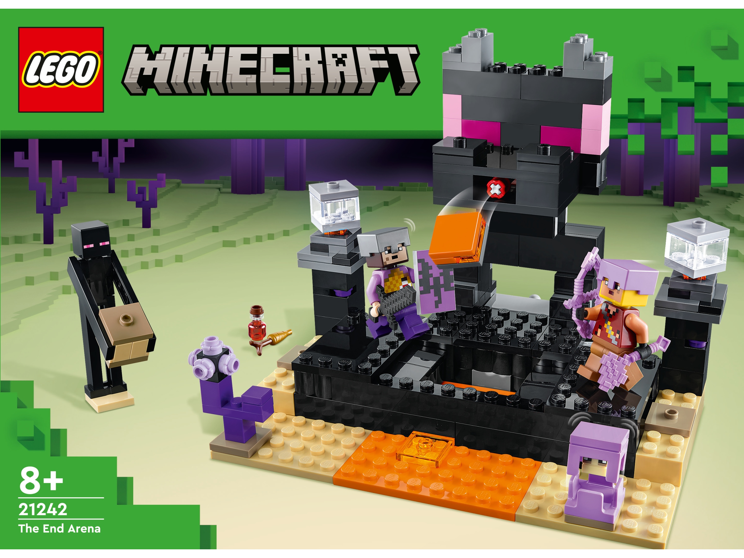 - Ikonisk sted fra spillet – LEGO® Minecraft® End-arena (21242) er en actionfylt Minecraft-scene, hvor spillere møtes til kamp mot hverandre