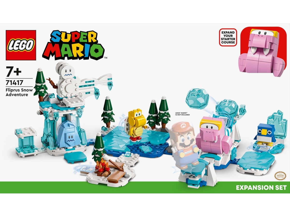 Med Ekstrabanen Fliprus’ snøeventyr (71417) kan barn utvide LEGO® Super Mario™ universet sitt med en spennende snøbane og fire Super Mario™ figurer. Spillere får digitale mynter for å hjelpe LEGO® Mario™, LEGO® Luigi™ eller LEGO® Peach™ figuren sin (ikke inkludert) med å beseire en rød Koopa Troopa, Freezie og en Fliprus, gå på skøyter på «isen», varme seg ved «bålet» og gi en skjult frukt til pingvinungen som gave. (MERK: du må ha startbane 71360, 71387 eller 71403 for å kunne spille.) Hjelpeapp Last ned LEGO Super Mario appen for å få byggeinstruksjoner, inspirerende ideer og annet spennende innhold som gjør barns kreative opplevelse enda morsommere. Flott gaveidé Dette samlerlekesettet er en flott gave til trend-bevisste barn fra sju år. Med LEGO Super Mario startbaner og ekstrabanesett kan fans utvide, bygge om og tilpasse personlige og unike baner og få for timesvis med myntinnsamling.