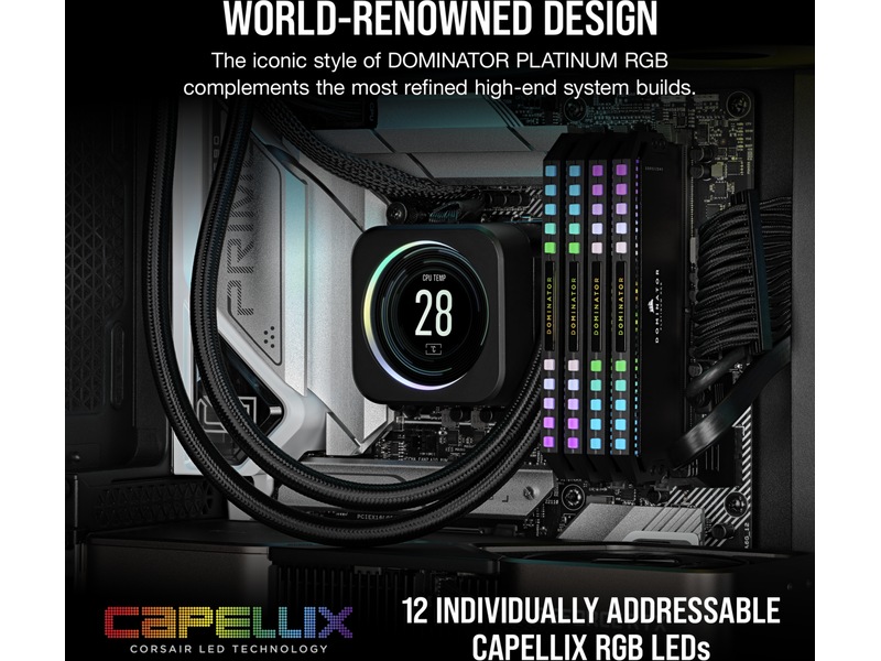 RAM-funksjoner Dual-path Heat Xchange (DHX), 12 ultralyse individuelt adresserbare CAPELLIX RGB LED-er, Innebygd ekstrem overklokking Power Management IC (PMIC), Intel Extreme Memory Profiles (XMP 3.0), Spenningsreguleringsstøtte, Høyytelses PCB, Corsair iCUE-støtte, Anodized aluminum heatspreader, Dynamisk flersone RGB-belysning