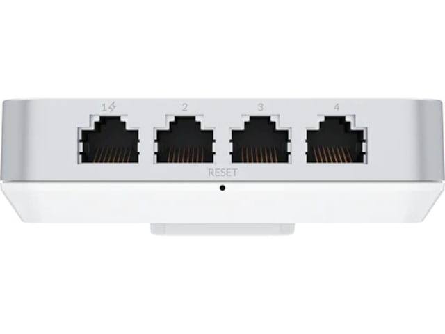 Støtte for WiFi 6 (2,4/5 GHz-bånd) 5,3 Gbps samlet gjennomstrømningshastighet (1) GbE RJ45-port (PoE In) (4) GbE RJ45-porter, inkludert én som støtter PoE-utgang*