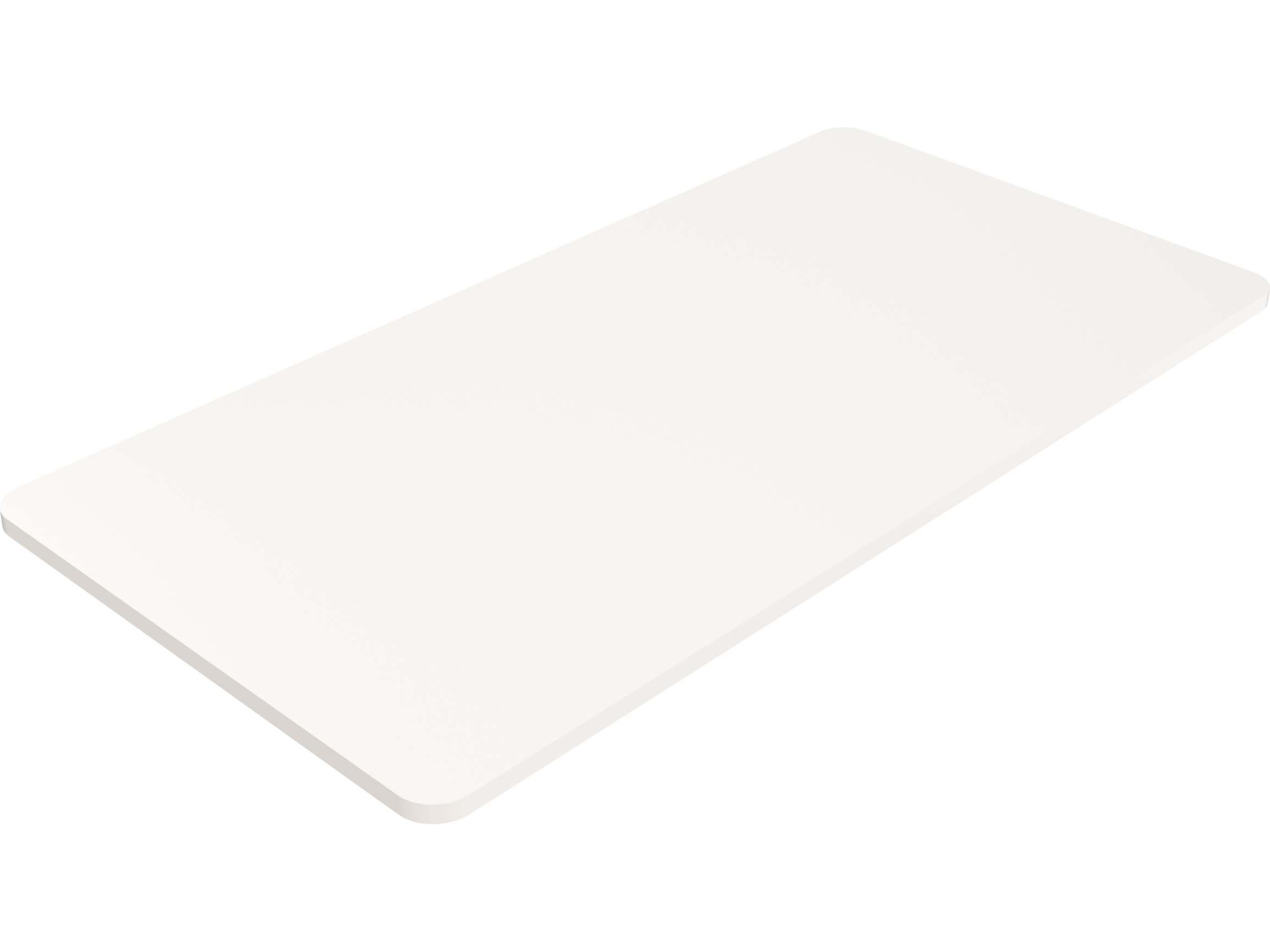 Skrivebordsplate med avrundede kanter og forborede skruehull. Bordplaten er laget av spon og har en laminert overflate som gjør platen slitesterk og legg å holde ren.