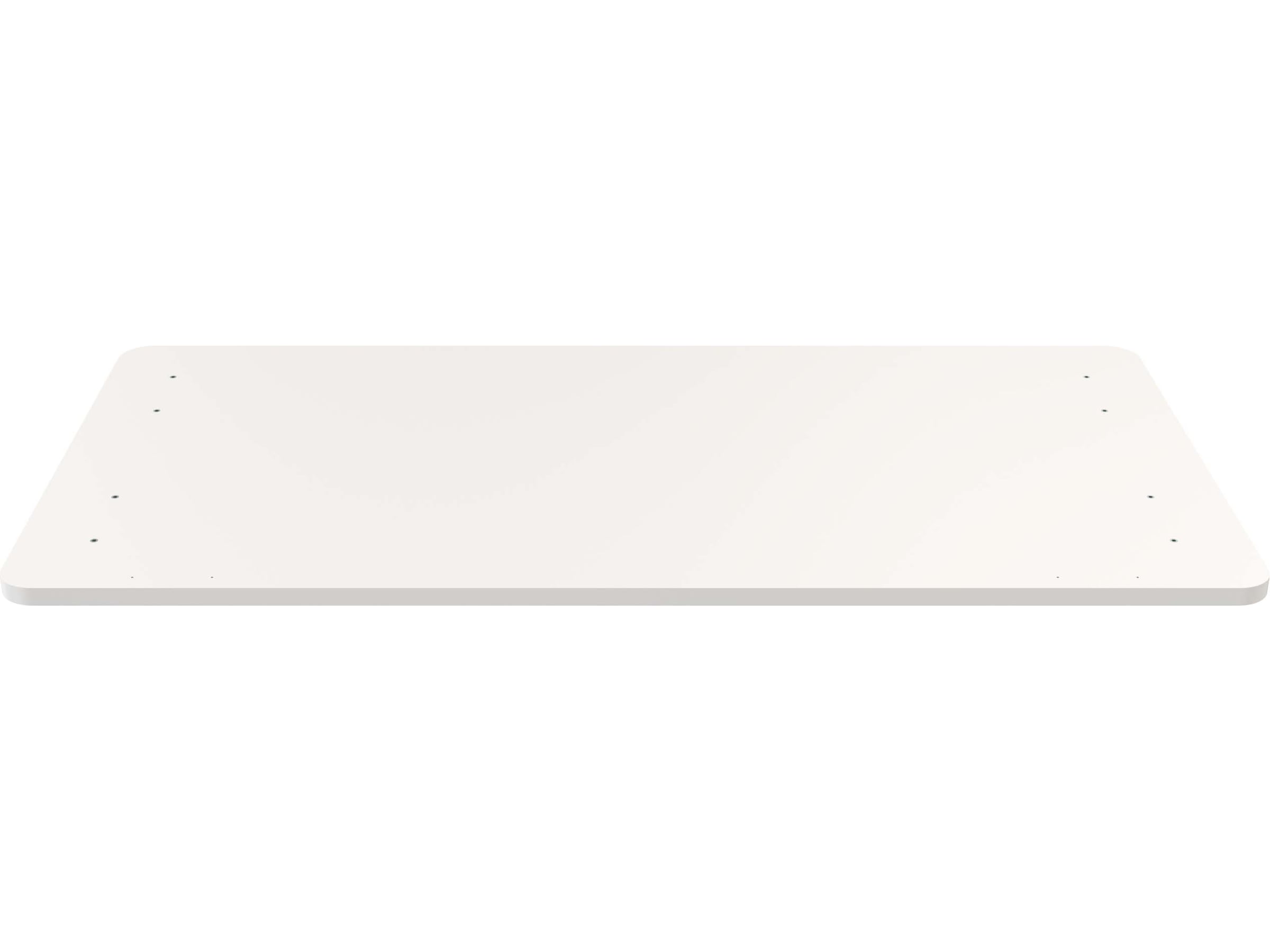 Skrivebordsplate med avrundede kanter og forborede skruehull. Bordplaten er laget av spon og har en laminert overflate som gjør platen slitesterk og legg å holde ren.