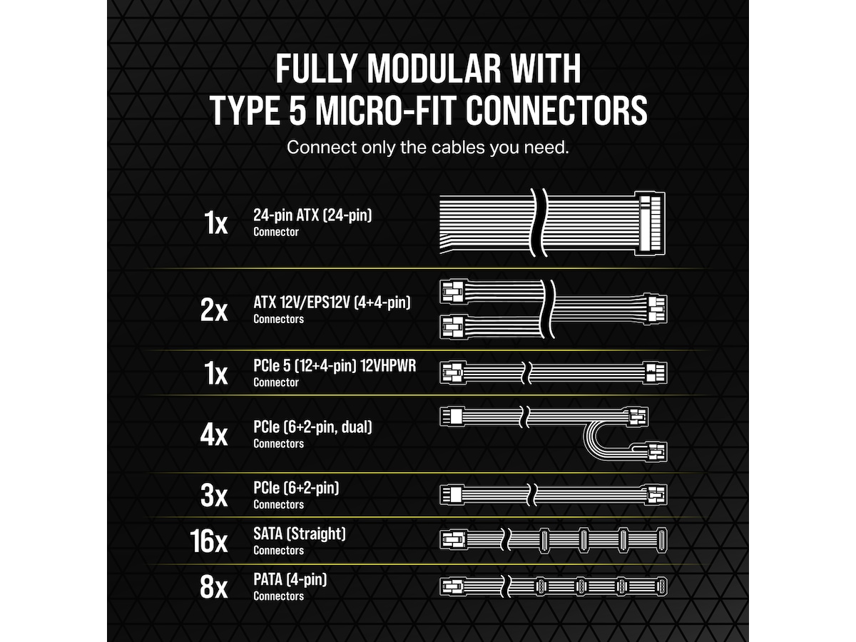 Fullt modulære CORSAIR Type 5 Gen 1 micro-fit PSU-kabler, slik at du kun kobler til de kablene systemet ditt trenger samtidig som det tar opp mindre plass.