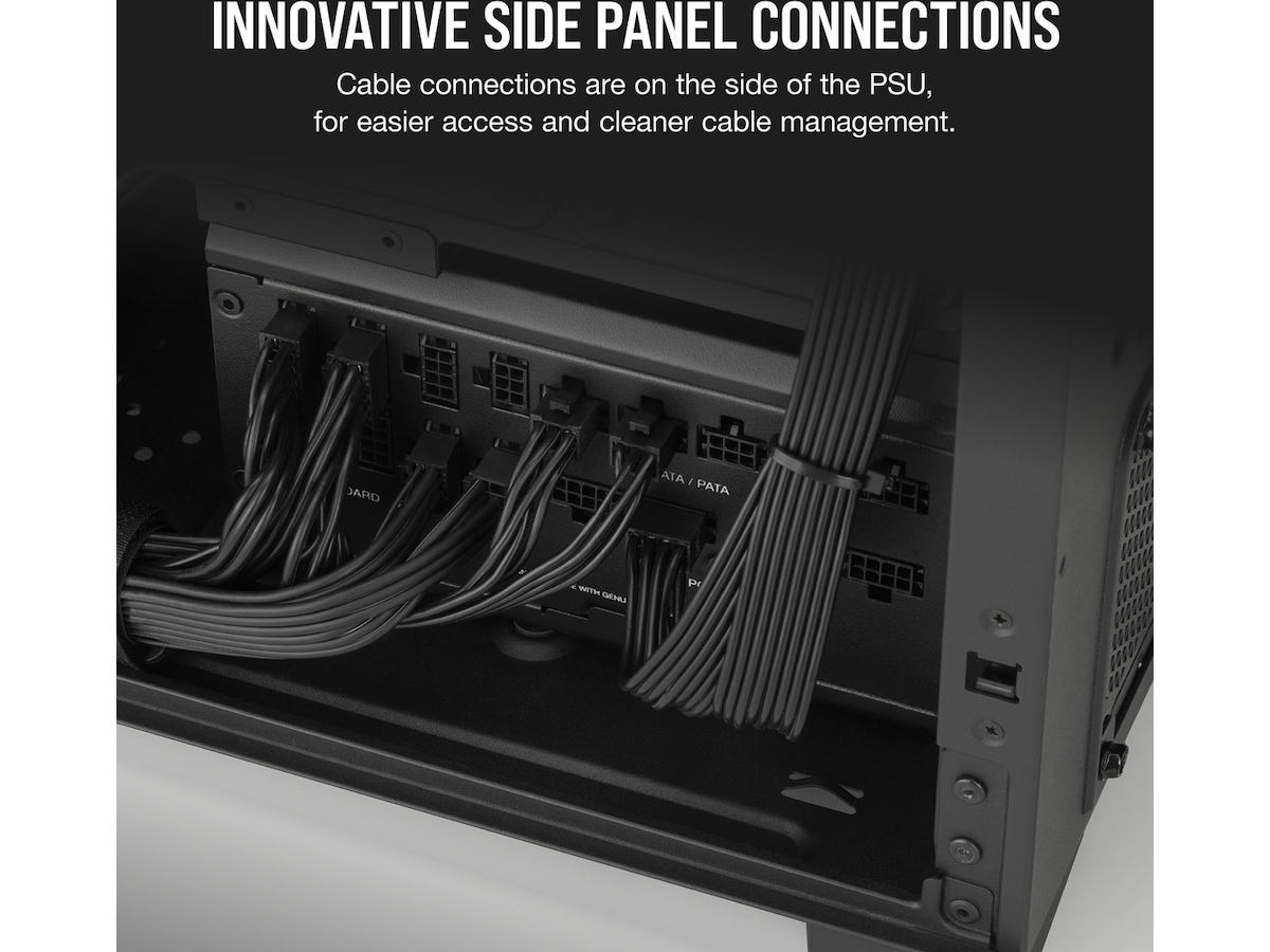 Et innovativt, patentsøkt strømforsyningspanel på siden med modulære tilkoblinger lar deg plugge kabler inn i sideoverflaten på strømforsyningen, noe som gjør det enklere å koble til og administrere kablene dine enn noen gang før.