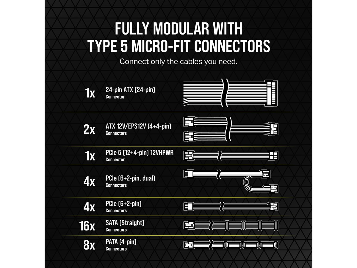 Fullt modulære CORSAIR Type 5 Gen 1 micro-fit PSU-kabler, slik at du kun kobler til de kablene systemet ditt trenger samtidig som det tar opp mindre plass.