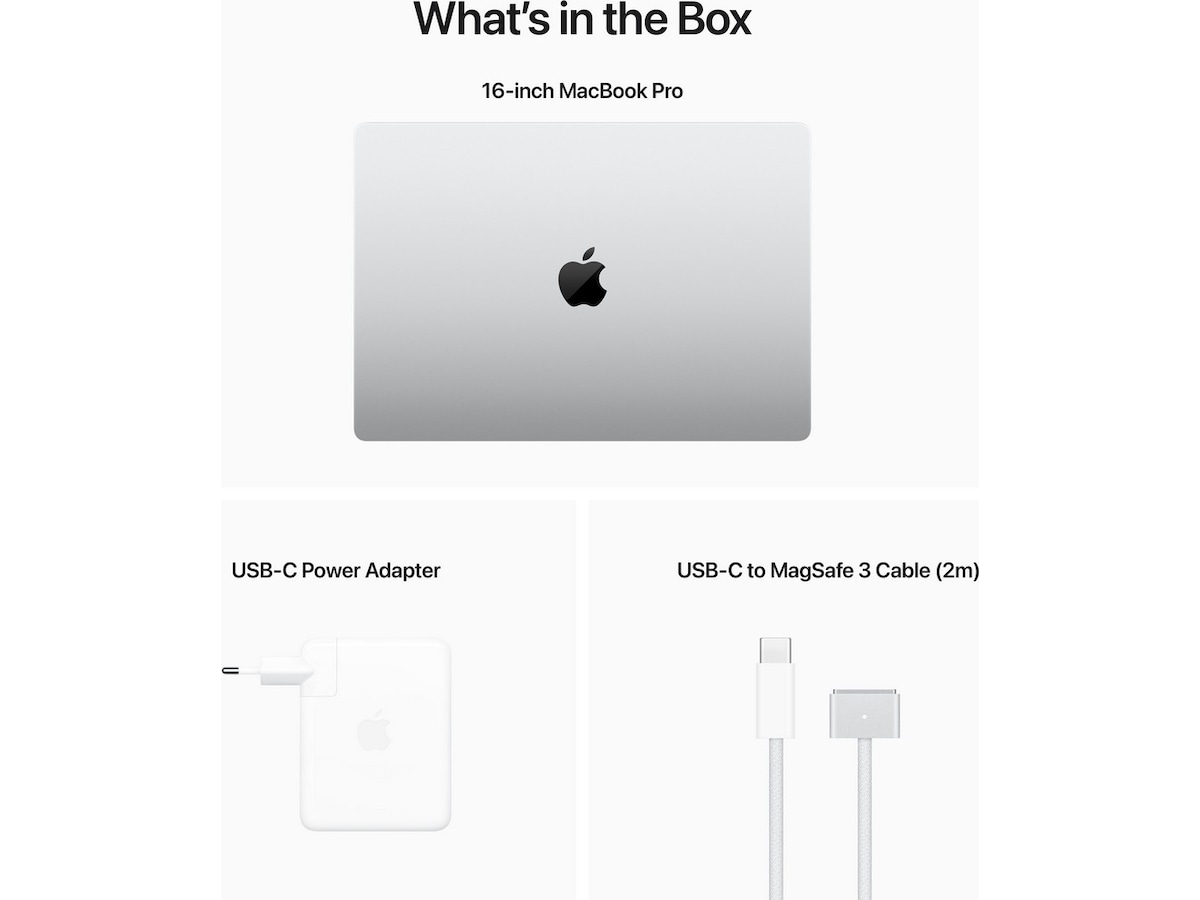 - Tre Thunderbolt 4-porter, HDMI-port, SDXC-kortplass, hodetelefonutgang, MagSafe-ladeport