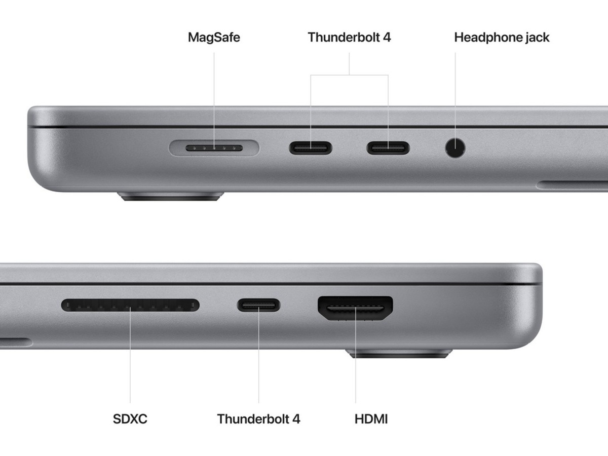 - Tre Thunderbolt 4-porter, HDMI-port, SDXC-kortplass, hodetelefonutgang, MagSafe-ladeport