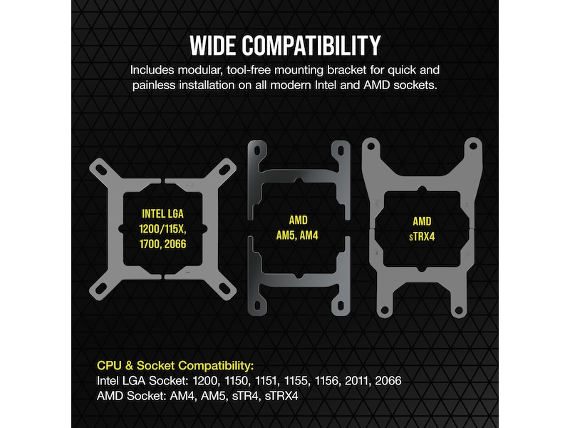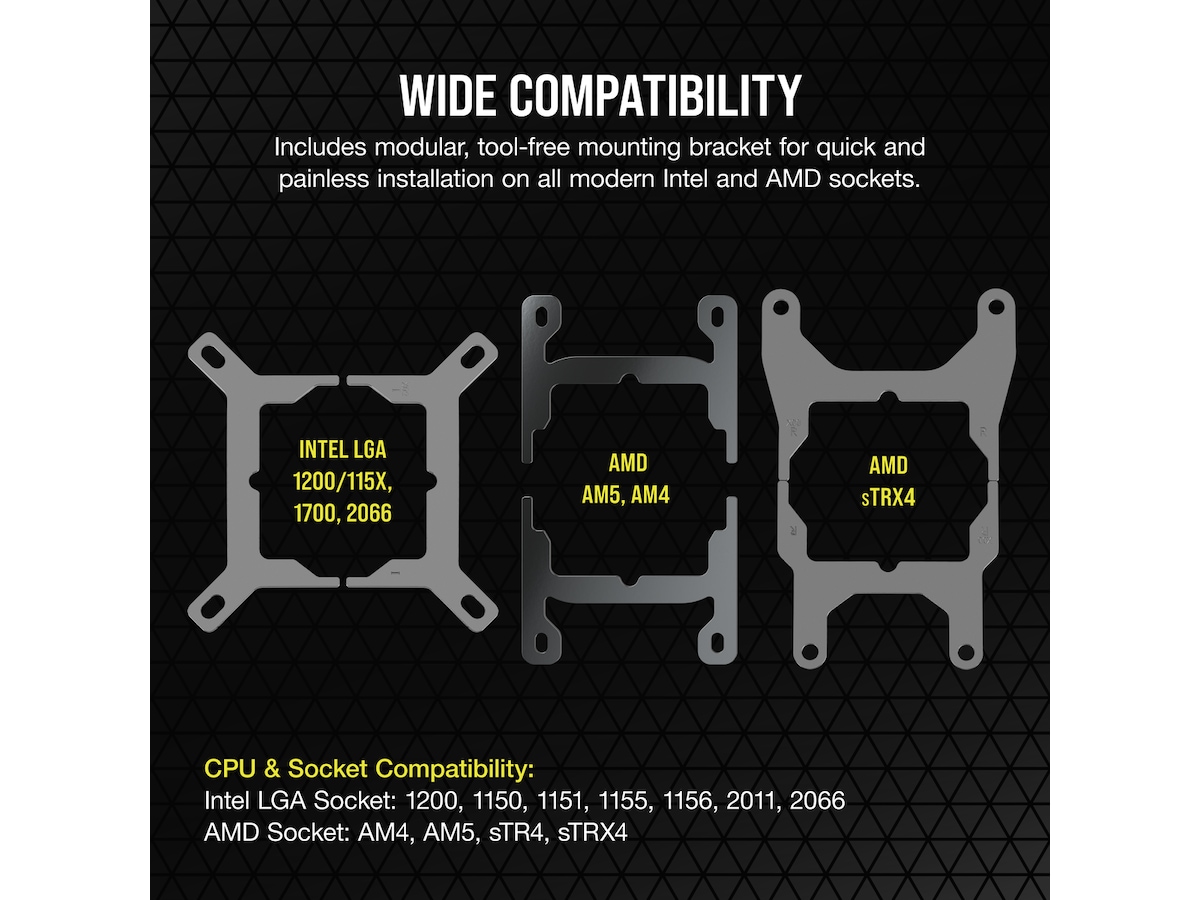 En utvidet rørlengde på 400 mm (H100i) / 450 mm (H150i, H170i), modulære verktøyfrie monteringsbraketter gir enkel installasjon på de nyeste hovedkortsoklene fra Intel® og AMD®, inkludert LGA 115X, 1200, 1700, 2011 og 2066, pluss AMD Socket AM4, AM5 og sTRX4/sTR4.