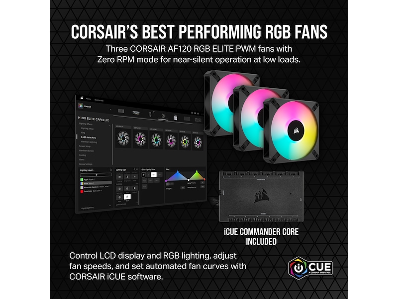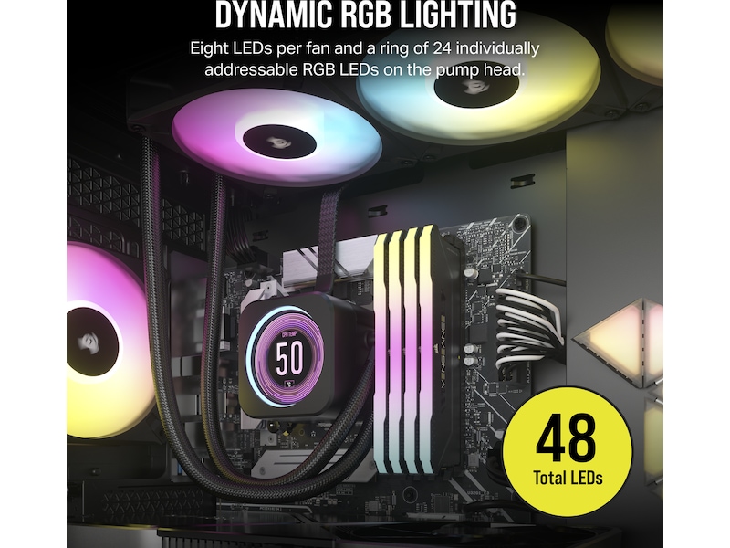CORSAIR AF RGB ELITE PWM-vifter med AirGuide-teknologi leverer massiv luftstrøm med lite støy langs en 240, 360 eller 420 mm radiator med høy overflate for ekstrem CPU-kjøleytelse.