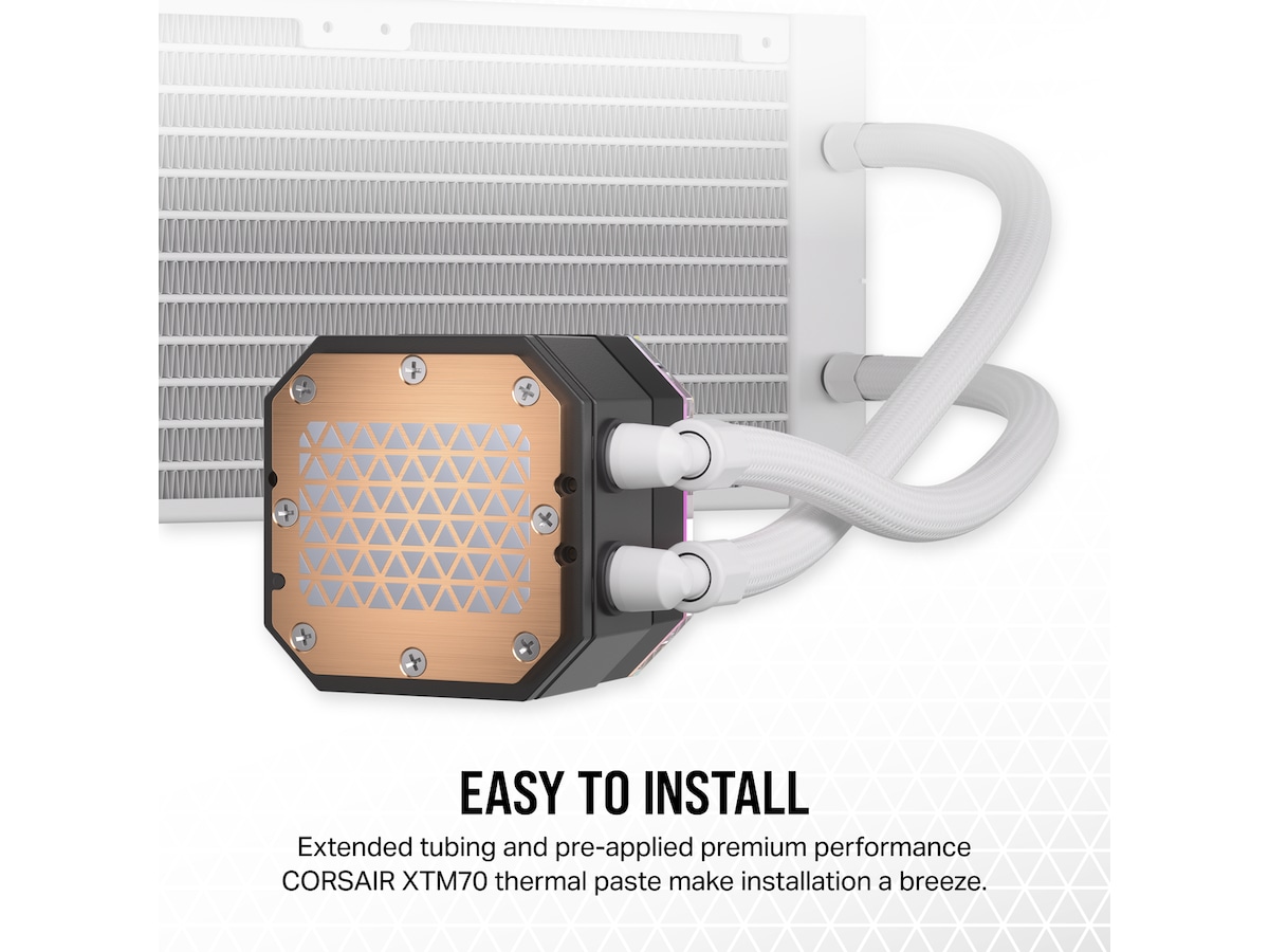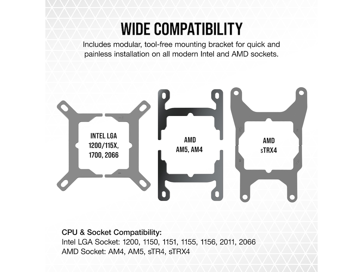 En utvidet rørlengde på 400 mm (H100i, H115i) / 450 mm (H150i, H170i), modulære verktøyfrie monteringsbraketter og ferdig påsmurt kjølepasta XTM70 gir enkel installasjon på de nyeste hovedkortsoklene fra Intel® og AMD®, inkludert LGA 115X , 1200, 1700, 2011 og 2066, pluss AMD Socket AM4, AM5 og sTRX4/sTR4.