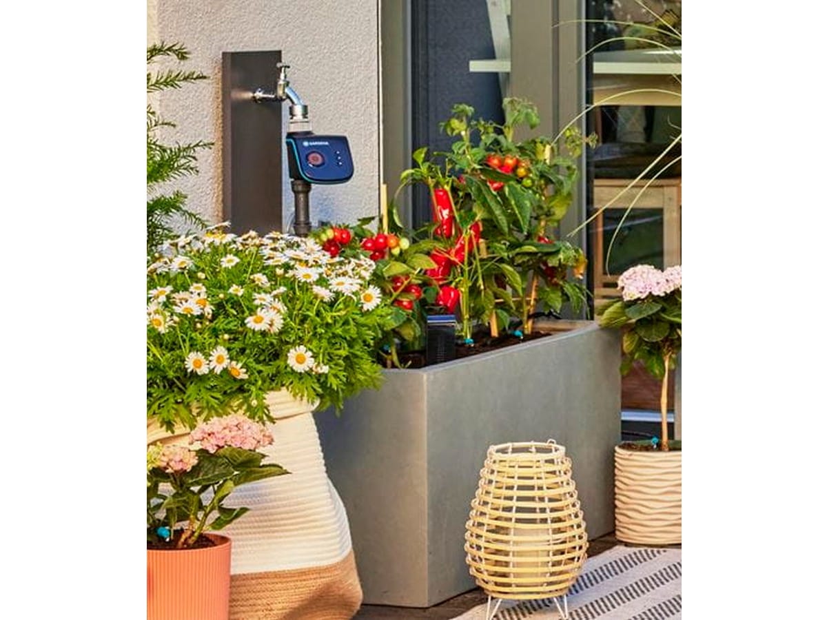 Settet er ideelt for vannbesparende dryppvanning av i alt 30 potteplanter med ulikt vannbehov på terrassen – både for potteplanter og planterader i kasser eller krukker.