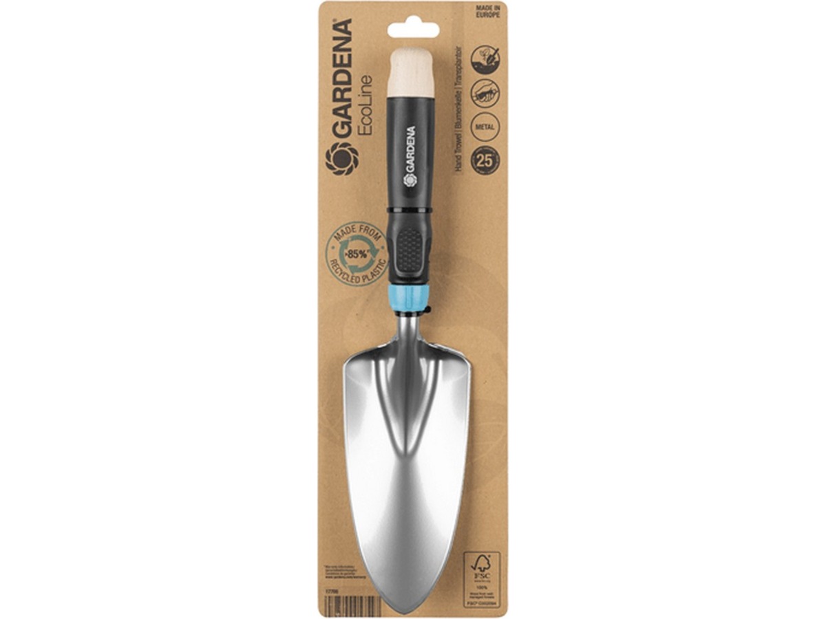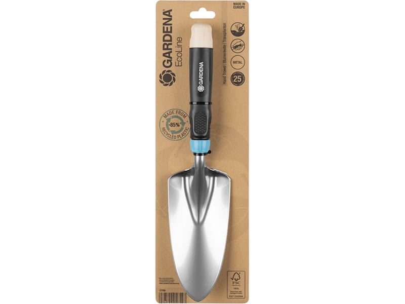 GARDENA EcoLine Plantespade er bærekraftig designet for alle dine potte-og planteoppgaver i blomsterpotter, plantekasser og bed. Plasten som benyttes i plantespaden er laget av mer enn 85% resirkulert materiale, hovedsaklig fra husholdningsavfall. Stål laget av mer enn 25% resirkulert metall i tillegg benyttes FSC® 100%-sertifisert tre. Det tidløse og tiltalende designet i kombinasjon med tre- og metallelementer gjør hagearbeidet til en elegant oppgave.
