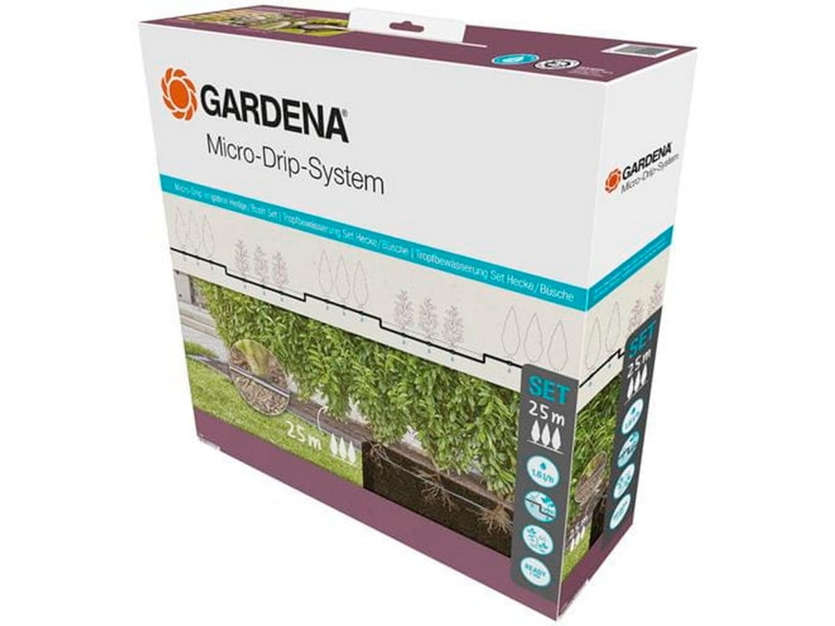 Dryppvanningsrør for busker eller hekker (25 m) fra GARDENA egner seg like godt til installasjon over og under bakken. Et trykkompenserende drypphode er innlemmet hver 30. cm langs dryppvanningsrøret, og egner seg derfor til vanning av busker eller hekker.