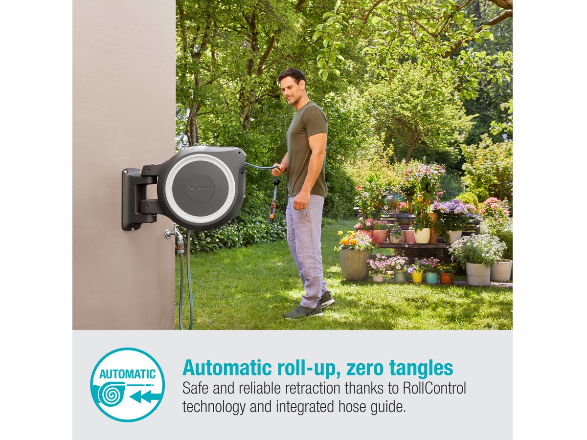 With a light pull at the end of the hose, the integrated steel spring is activated and rewinds the hose automatically and reliably. The RollControl technology ensures slow and safe retraction, no matter how far the hose is unrolled.