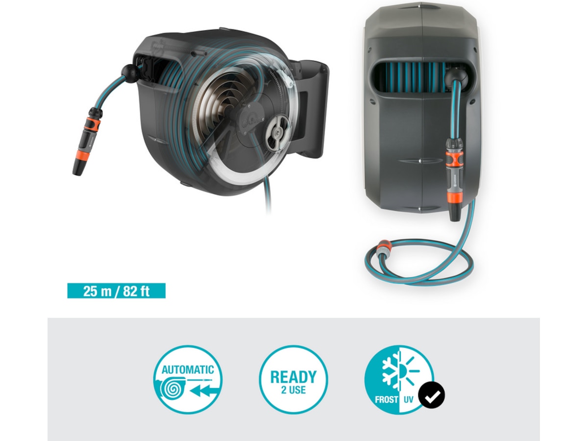 Den veggmonterte Slangeboksen RollUp M/L leveres med en veggbrakett, en 25 meter vanningsslange, en tilkoblingsslange, alle nødvendige GARDENA-systemdeler, og en dyse med to forskjellige spraystråler.