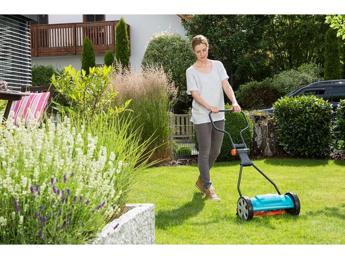 Sylindergressklipperen Classic 330 fra GARDENA lar deg klippe plenen på en miljøvennlig måte, og sparer strøm og klipper rolig. Den manuelle gressklipperen bruker en berøringsfri, presis klippeteknikk. Når den trykkes inn, roterer den herdede, non-stick-belagte klippesylinderen laget av kvalitetsstål forbi et fast motblad.