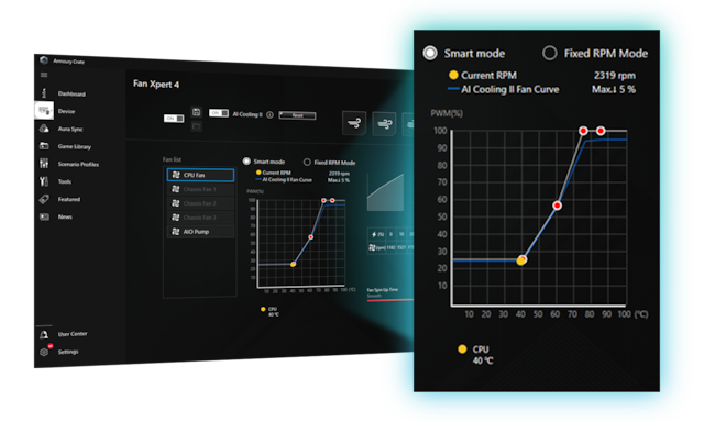 Programvaren ASUS Fan Xpert 4 tilbyr omfattende kontroll over vifter, vannpumper og alt-i-ett-kjølere (AiO). Enten du kjøler med luft eller vann, konfigurerer en Auto-Tuning-modus alle parametere på en intelligent måte med ett enkelt klikk. Det finnes også en Extreme Quiet-modus som reduserer viftehastigheter til under standardens minimum for å holde systemet stillegående når du utfører lette oppgaver. Vifter, vannpumper og alt-i-ett-kjølere kan også styres via UEFI BIOS.