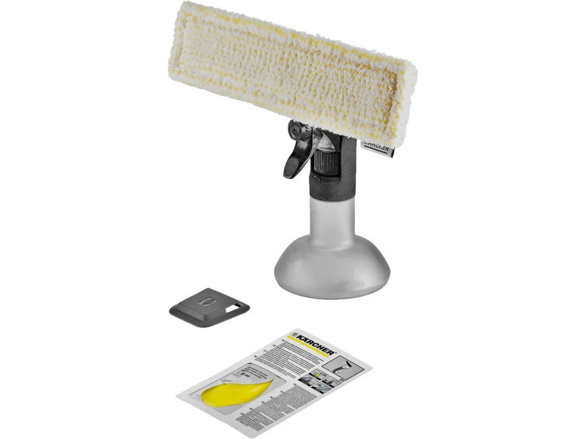 Sprayflaskesettet inneholder mikrofiberklut med borrelås, brede og smale vindusnaler (justerbar), grovsmusskrape og 20 ml rengjøringskonsentrat.