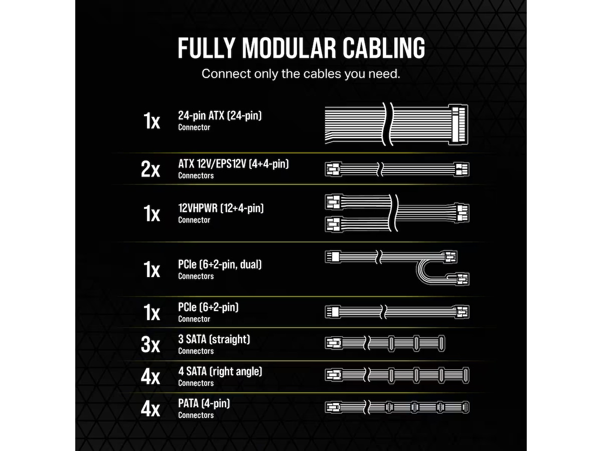 Strøm 15-stifts SATA-kabel 80 cm, 8-pins PCI Express-strøm med avtakbar 2-pins delmodulkabel 65 cm, 16-stifts 12VHPWR strømkabel 65 cm, 2x 8-stifts PCI Express-strøm med avtakbar 2-stifts delmodulkabel 75 cm, 2 x strøm 8-stifts +12 V med avtakbar 4-stifts seksjon modulær kabel 65 cm, 4-pins intern strømkabel 75 cm, ATX-strømkabel 61 cm, AC-inngangskabel - ekstern