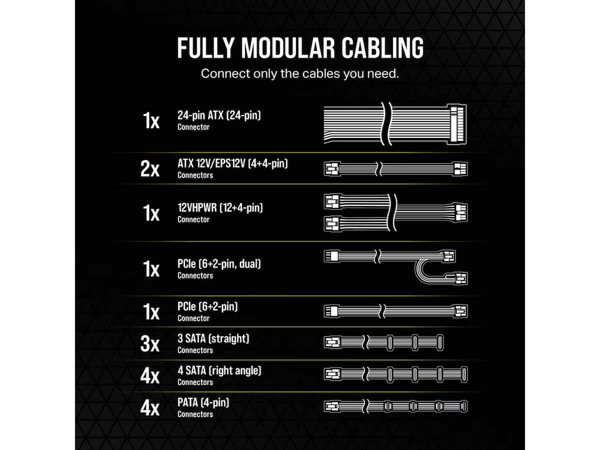 1 x 12VHPWR, 1 x strøm 24-pins ATX, 7 x 15-pins seriell ATA-strøm, 2 x strøm 8-pins EPS12V med avtakbar 4-pins ATX12V-del, 4 x 4-pin intern strøm, 3 x 8-pins PCI Express-strøm med avtakbar 2-pins del